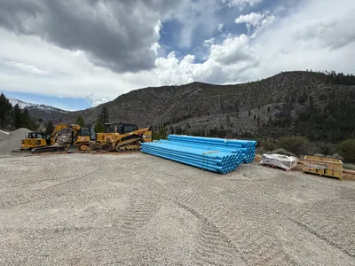 The image shows a construction site in a mountainous area with several pieces of heavy machinery like bulldozers and an excavator positioned on a dirt area. Various piles of gravel are visible in the foreground. The machinery is parked alongside a gravel-covered surface, and additional materials appear to be staged nearby. The surrounding area is mountainous with pine trees visible, suggesting a remote location.