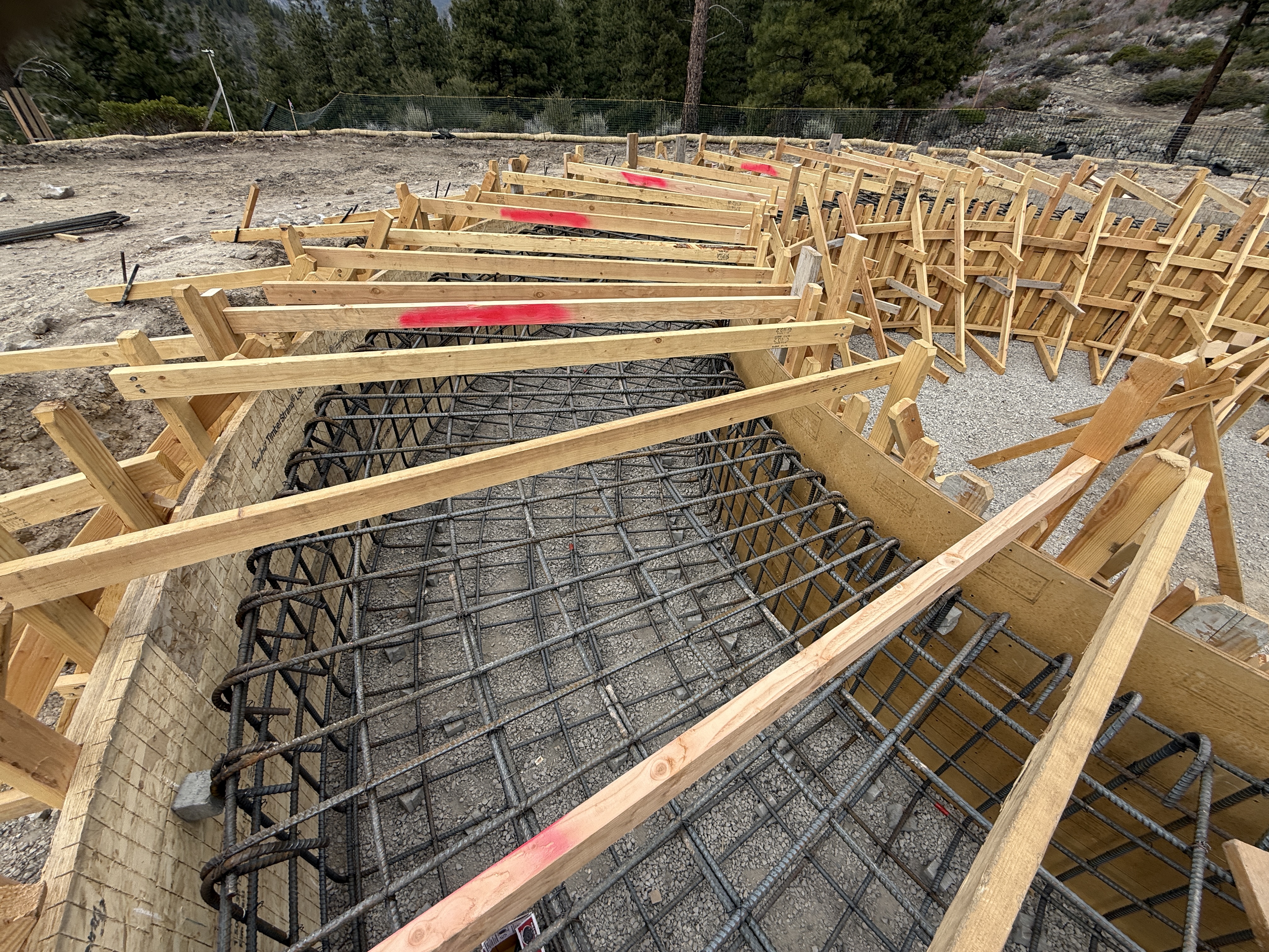 The image displays a construction site with rebar mesh being prepped for concrete pouring within a circular wooden formwork structure. The formwork is reinforced with wooden bracing. The surrounding area is a dirt-covered site, indicating foundation work in progress. Trees in the background suggest the project is in a rural or forested area.
