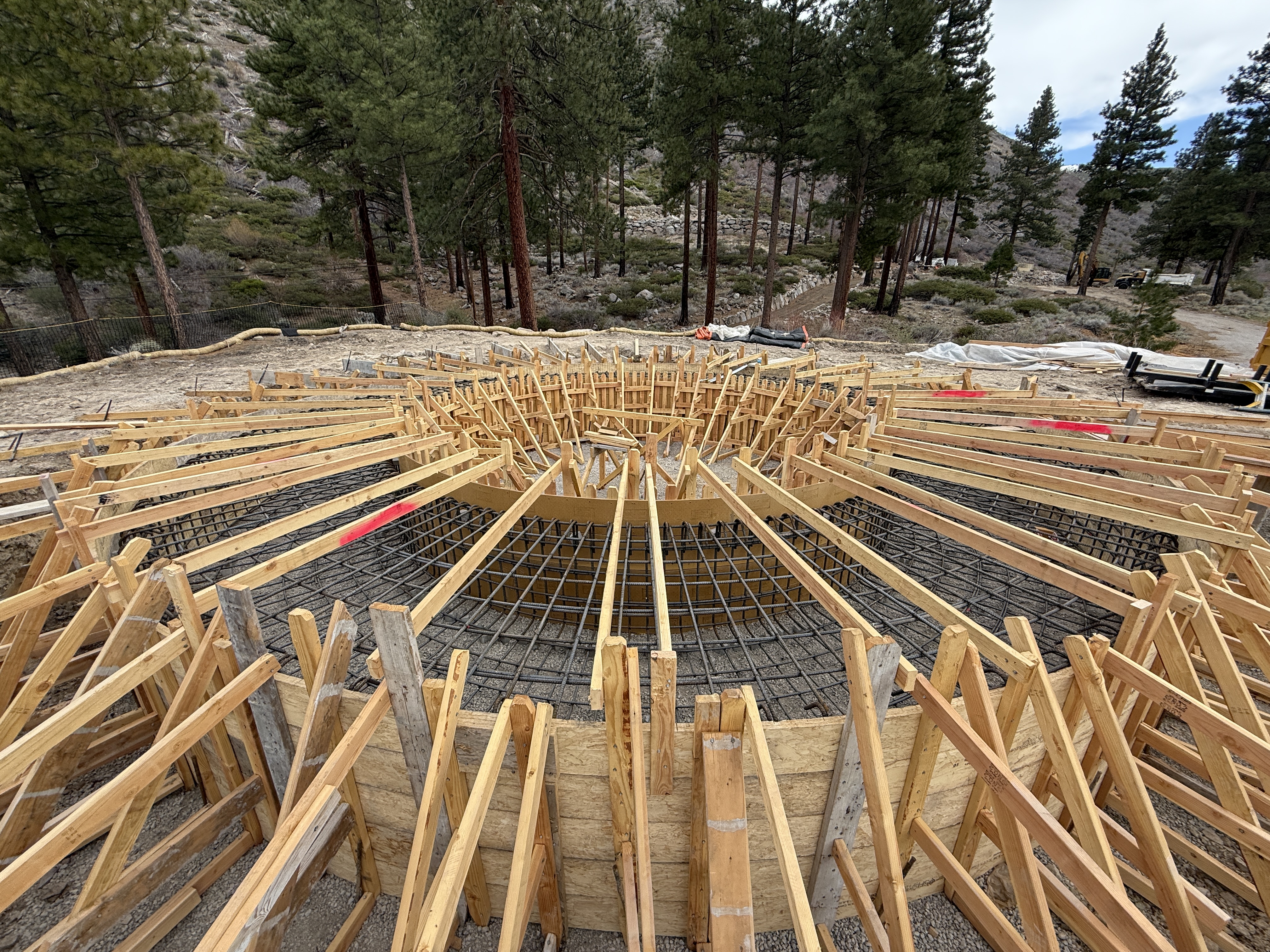 The image shows a circular arrangement of wooden formwork supporting a network of steel rebar, indicating preparation for concrete pouring. The setup is located in a forested area with trees in the background. Several wooden braces are used to stabilize the structure, likely as part of the process for building a tank foundation. The image captures a stage of construction focused on structural preparation.