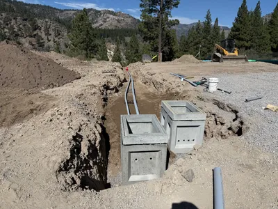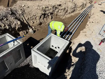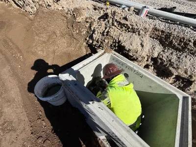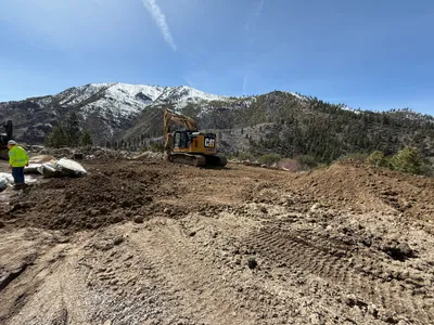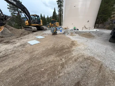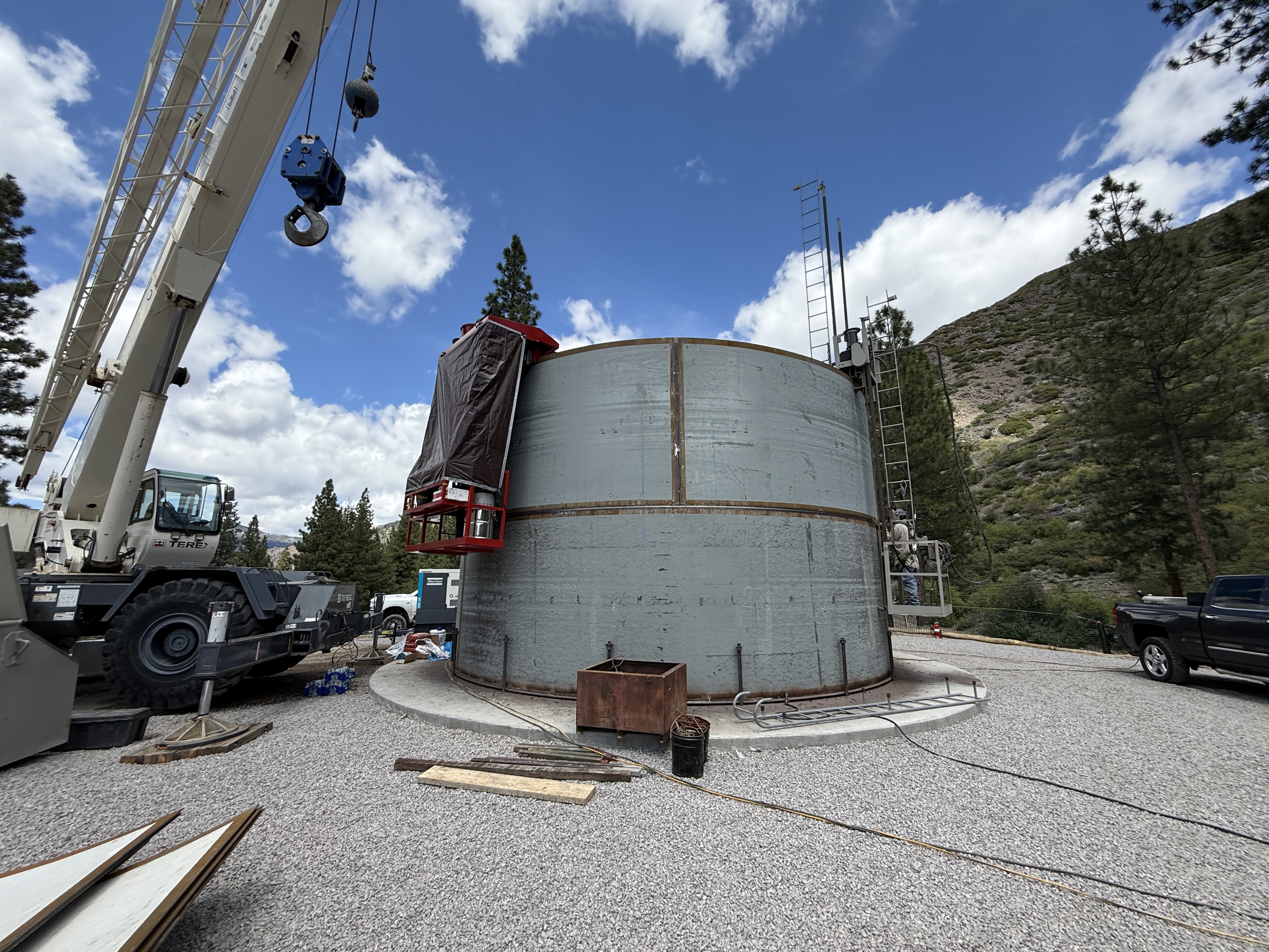The image shows a large cylindrical tank structure with a crane hoisting a component onto it or adjacent to it. The crane is positioned to the left of the tank, with its boom extended. On the right, a worker on a platform appears to be performing installation tasks. A pickup truck is parked nearby, along with various construction materials such as wood planks and metal parts on the gravel surface.