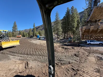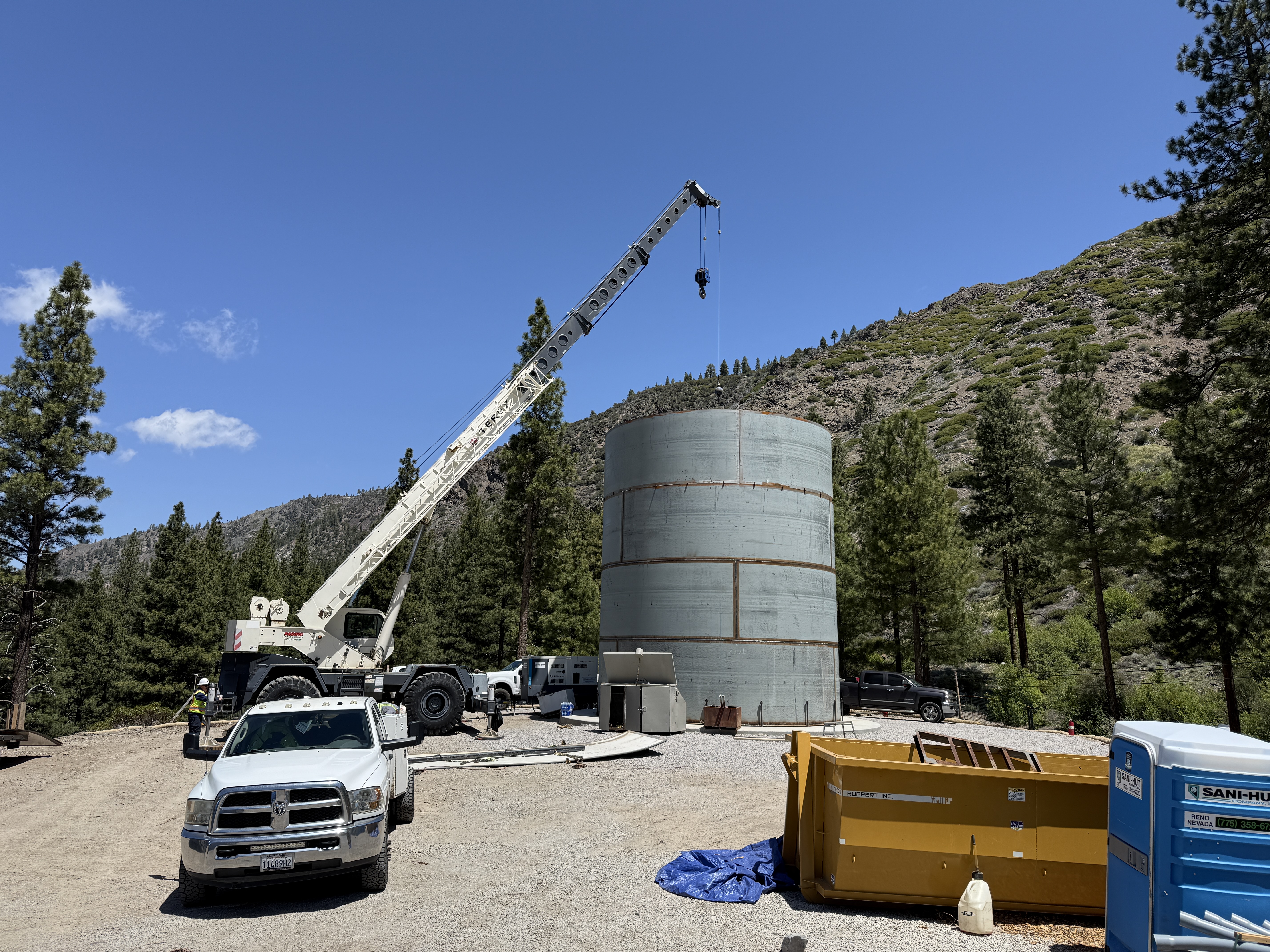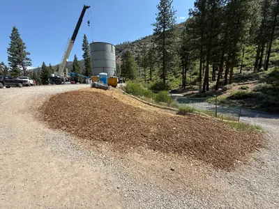 A crane is positioned to lift or place a large cylindrical tank on a prepared foundation area. Several vehicles, including a white truck and a portable sanitation unit, are present near the work area. Trees and a mountainous landscape surround the site, indicating a remote or rural location. Workers appear to be present on-site, suggesting ongoing activities.
