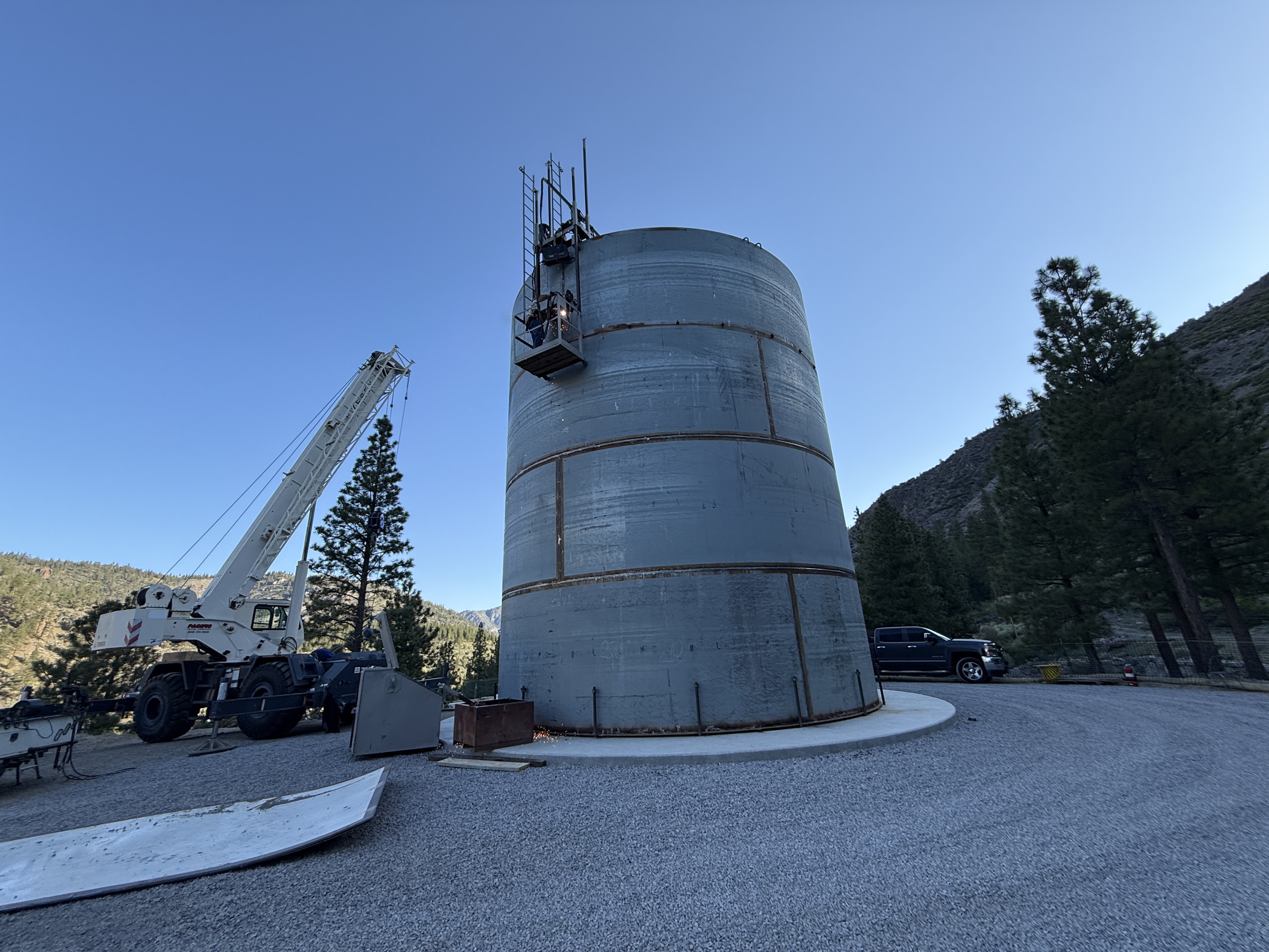 The image shows a large cylindrical storage tank with a crane positioned nearby. A worker appears on a platform attached to the tank, suggesting in-progress work. The crane is positioned on the left, with its arm elevated towards the top of the tank. A truck is visible near the tank, indicating active site activity.