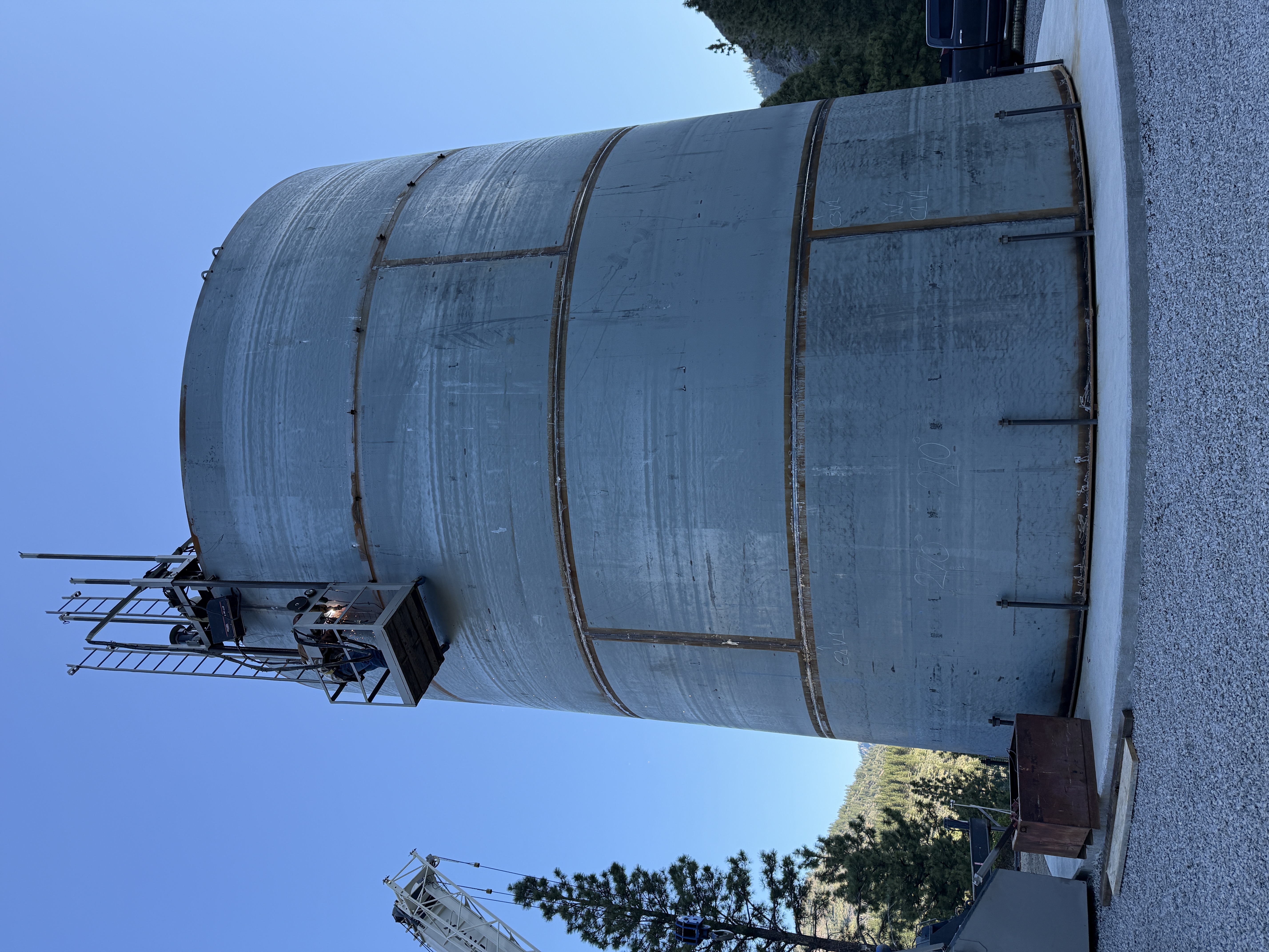 The image shows a large cylindrical tank with visible welding seams and an elevator scaffold attached to its side, indicating construction activity. There is a person on the scaffold performing work. The tank is set on a concrete foundation, surrounded by gravel. There is a metal scrap bin nearby and a vehicle visible in the background.