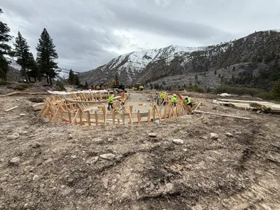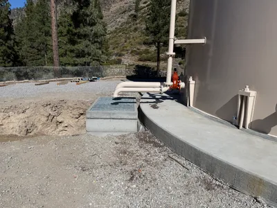 The image shows the interior of a cylindrical structure, possibly a tank or foundation. Ladders and a suspended work platform are positioned within the structure, suggesting installation or inspection activities. The structure's walls appear to be concrete with visible brackets and supports. The open top allows direct sunlight to illuminate the interior.