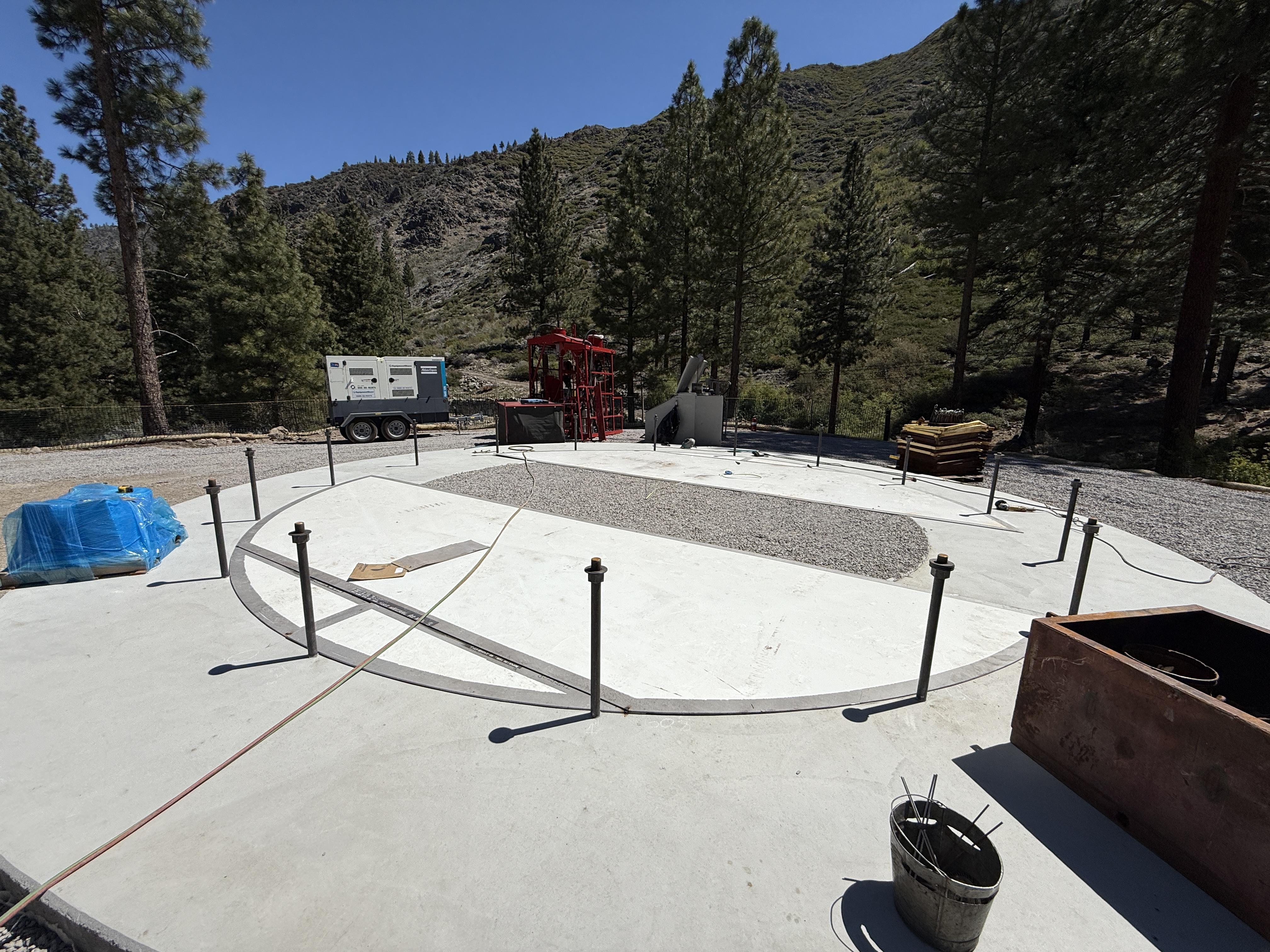 The image shows a concrete foundation with protruding rods, likely for a future tank installation. A generator is parked on the left side, and a piece of red machinery is visible in the background. Construction materials, including a blue wrapped item and stacked panels, are present on site. The area is surrounded by trees and hills.