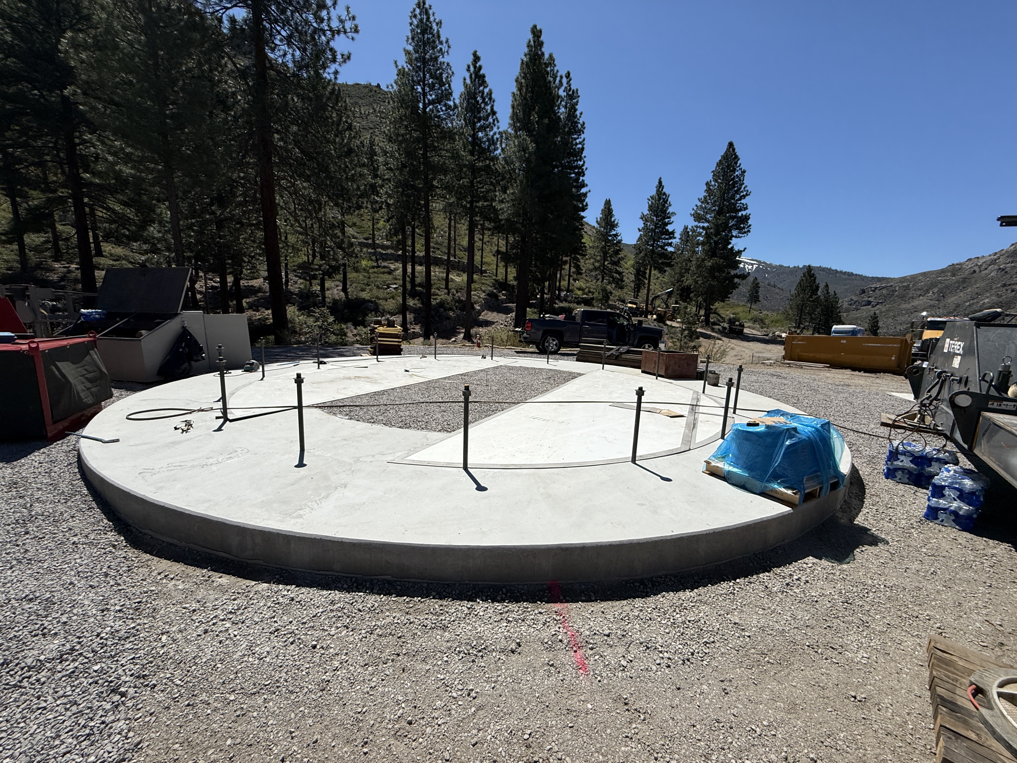 The image shows a circular concrete foundation with several protruding metal rods, indicating ongoing work for a structure, likely a tank. The site is surrounded by gravel with construction materials and machinery nearby. A few trees and a mountainous landscape can be seen in the background. The rods protruding from the foundation could be for future attachment or alignment purposes.