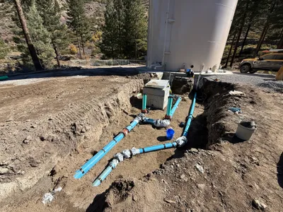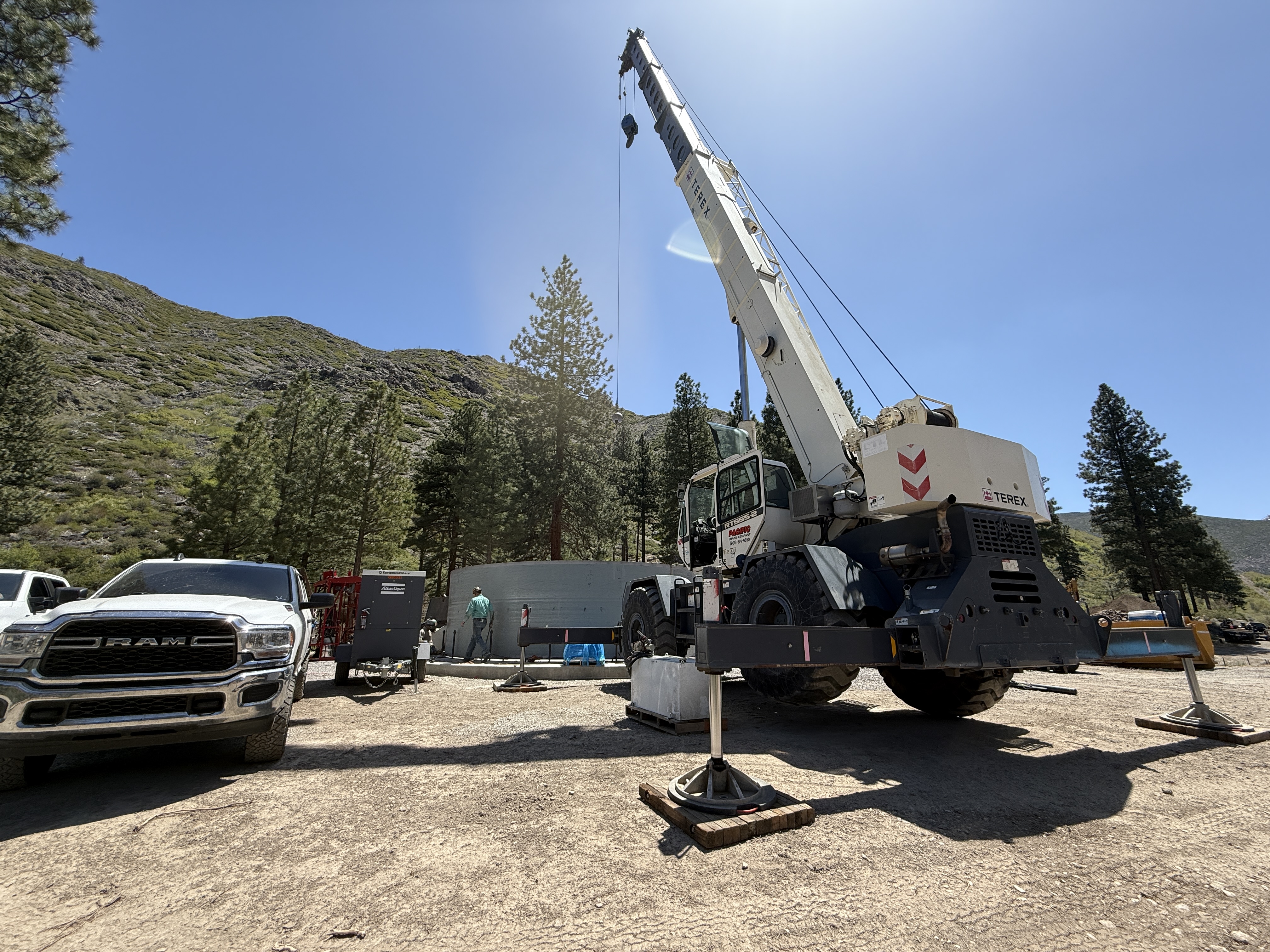 A Terex crane is prominently positioned with its boom extended upwards, indicating lifting activities. A RAM truck and another construction vehicle are parked beside it. Construction workers are present near a large cylindrical tank structure that appears to be on or near a foundation area. The setting is a dirt lot surrounded by trees and hills under clear skies.