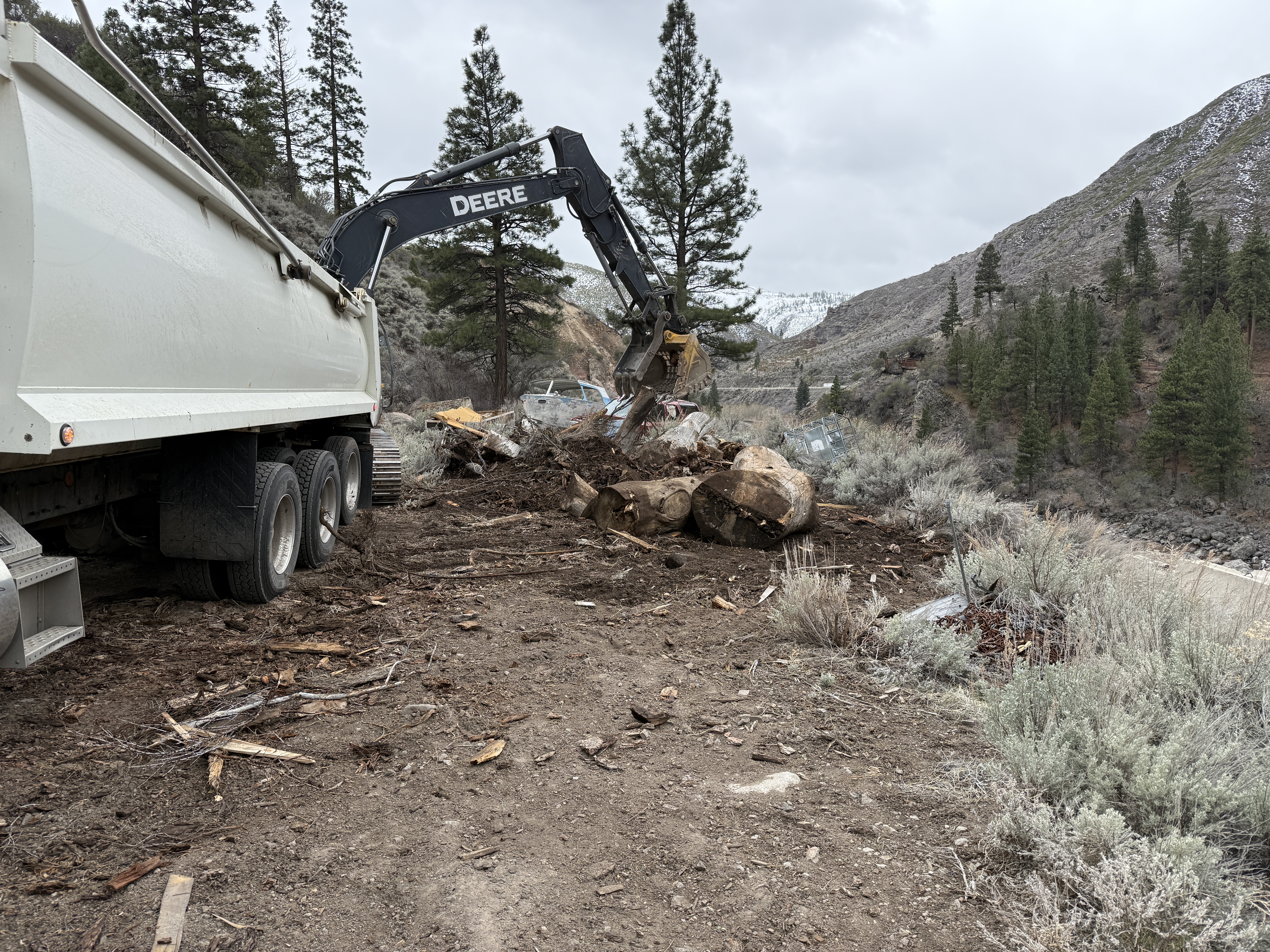 The image shows an excavator with 'Deere' branding using its bucket to collect debris, including rocks and shrubbery, next to a dump truck. The truck is parked on an uneven dirt surface with trees and hills in the background. The location appears to be in a rural or semi-rural area with natural vegetation. The excavator is actively engaged in cleanup work.