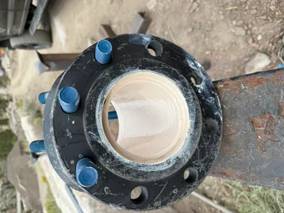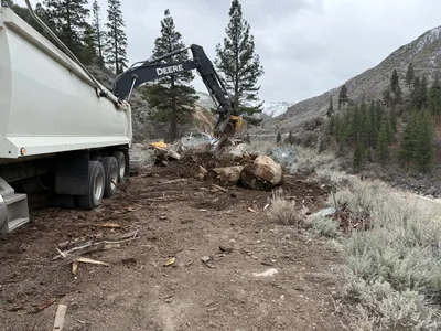 The image shows a rural site with clean-up activity underway. A truck is parked on the right side near various materials and debris. There are some organized structures and objects further down the dirt path. The terrain is uneven with shrubbery and dirt. There is a nearby road to the left, and some tents and containers are also visible.