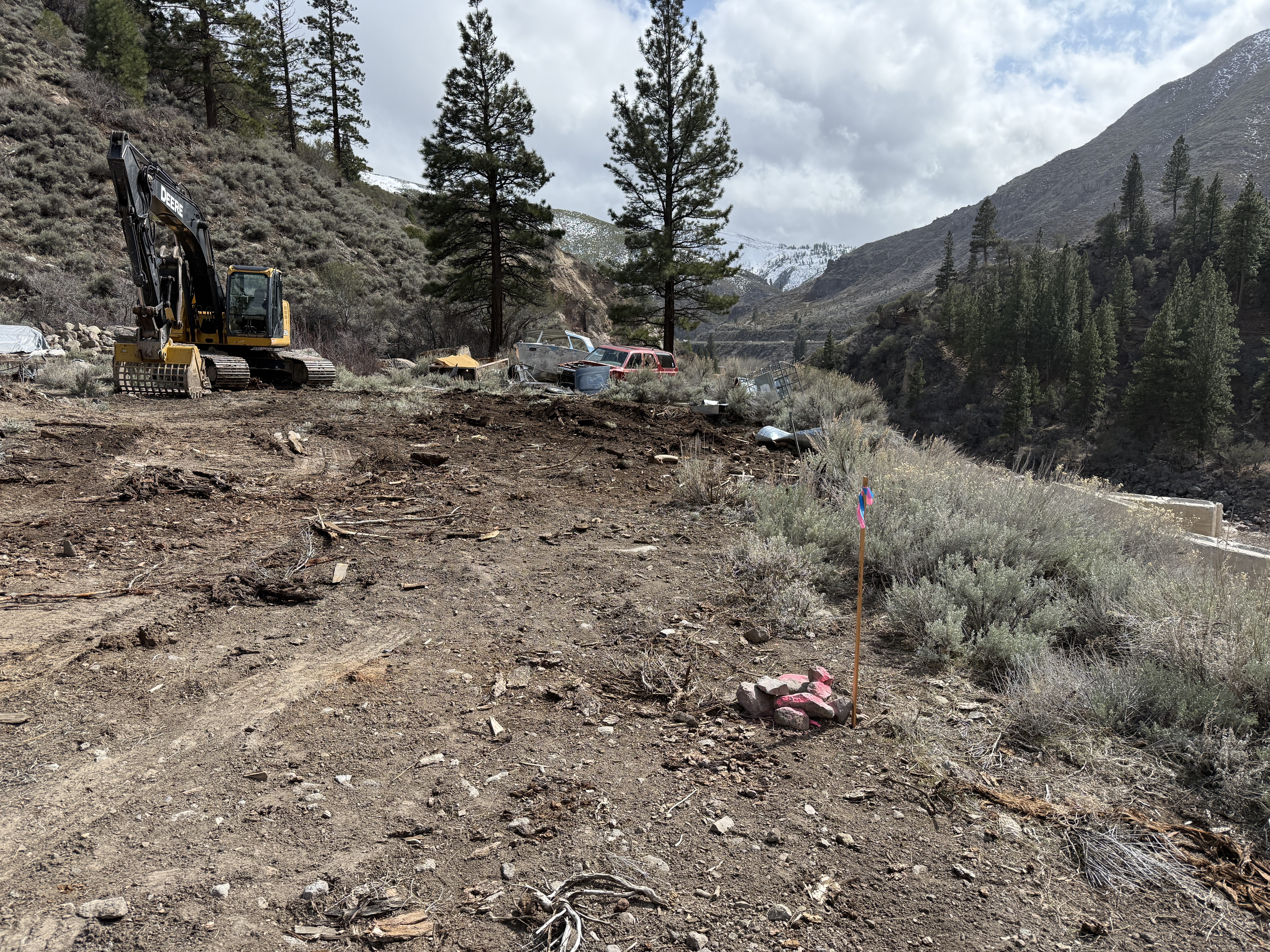 A yellow excavator is positioned on a cleared, uneven ground, likely for cleanup or preparation activities. The background includes a hillside with trees and some vehicles. There is a stake with a flag marking, possibly indicating survey or boundary points. The environment suggests a remote mountainous area with natural vegetation.