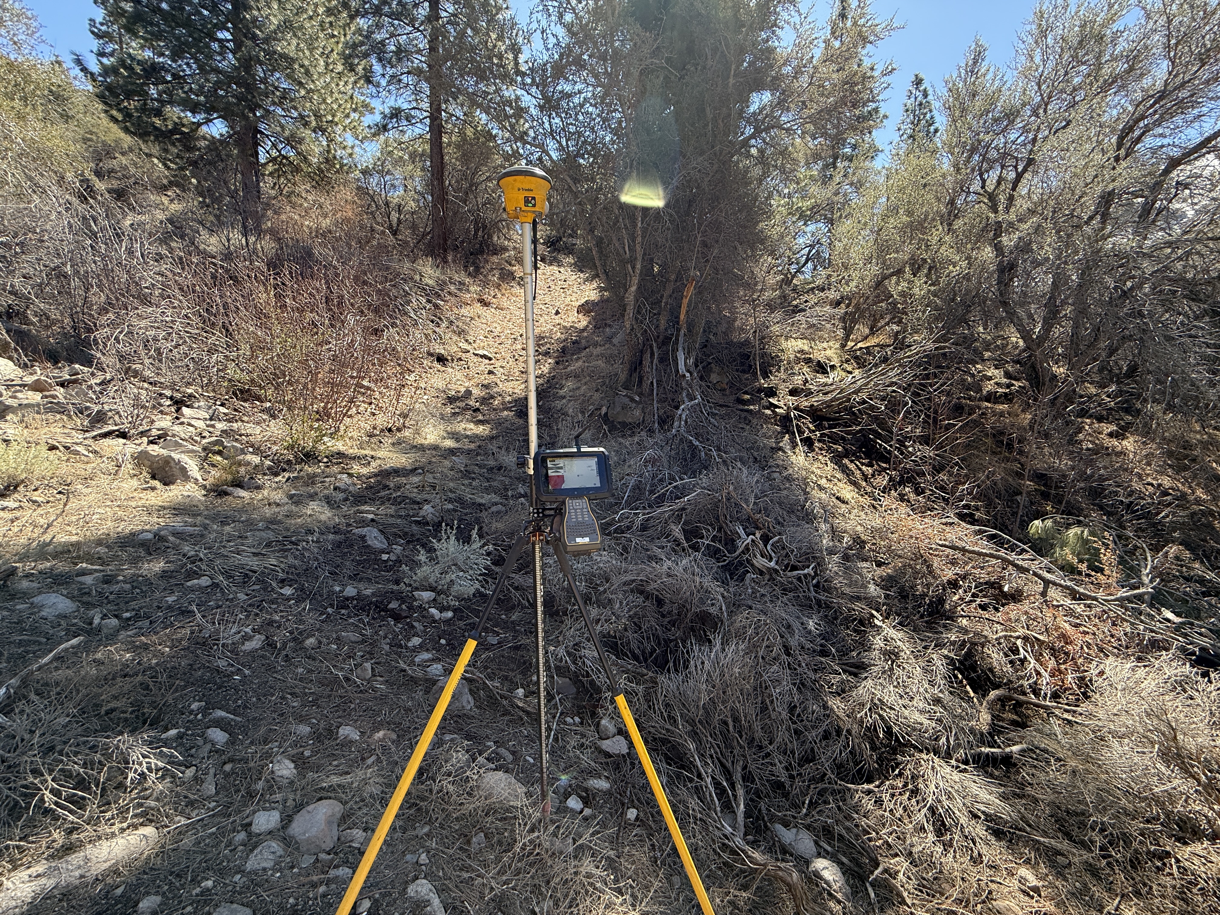 The image shows a surveying setup in a wooded area as part of the Floriston Filtration Project. A yellow GPS receiver is mounted on a tripod in the center of the image, with a connected data collector or controller attached. The surroundings include uneven, rocky terrain with sparse vegetation and trees. The scene indicates preparation or alignment activities related to waterline re-alignment.