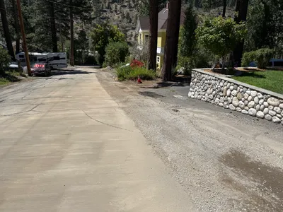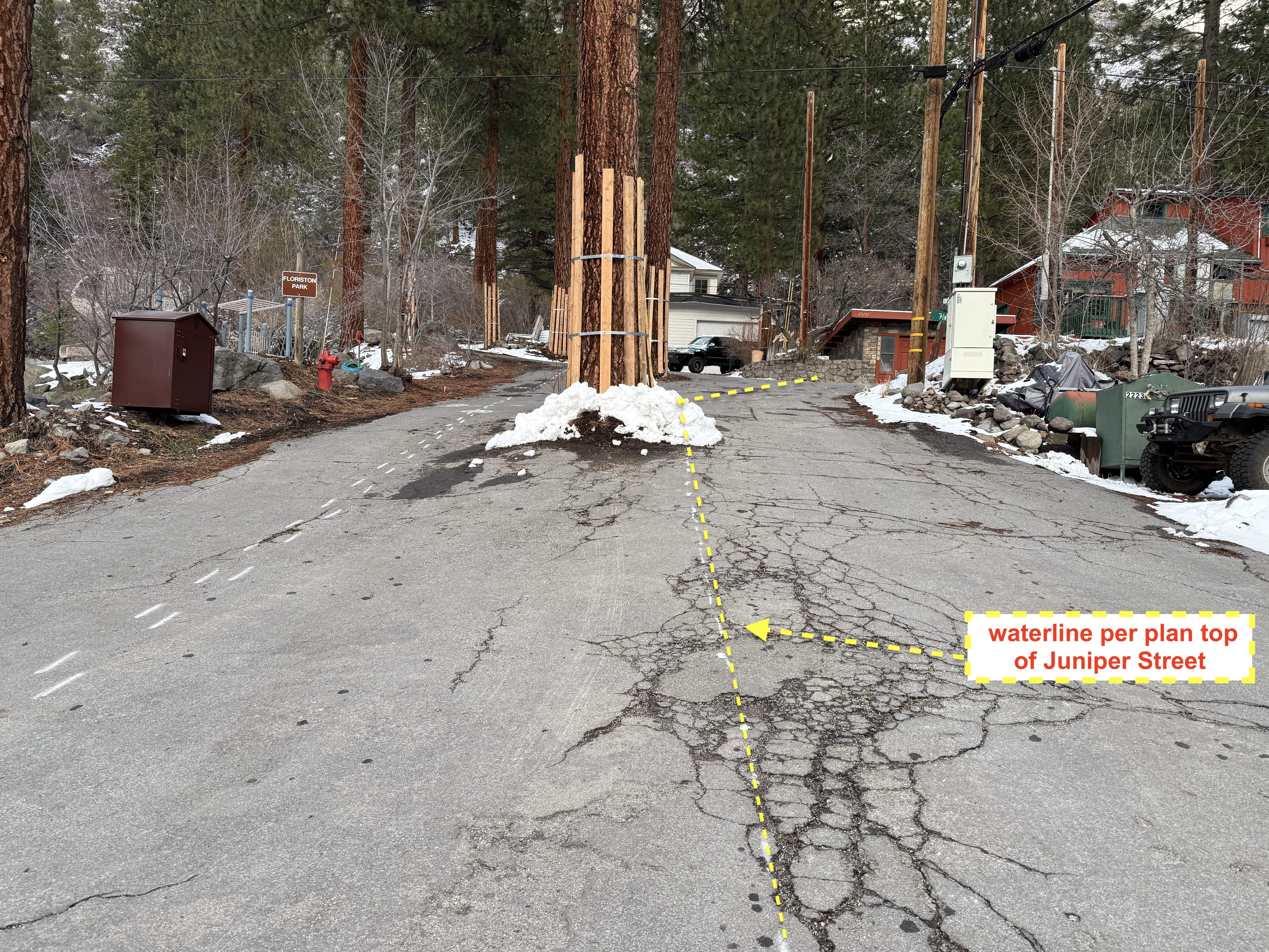 The image depicts a mostly snow-covered street where a waterline alignment is marked by dashed lines on the pavement. A pathway leads up the road shown slightly bending towards the left side. There are large trees lining the street, and a hydrant visible on the left. Snow is visible on the ground, and a vehicle can be partially seen in the background on the right.