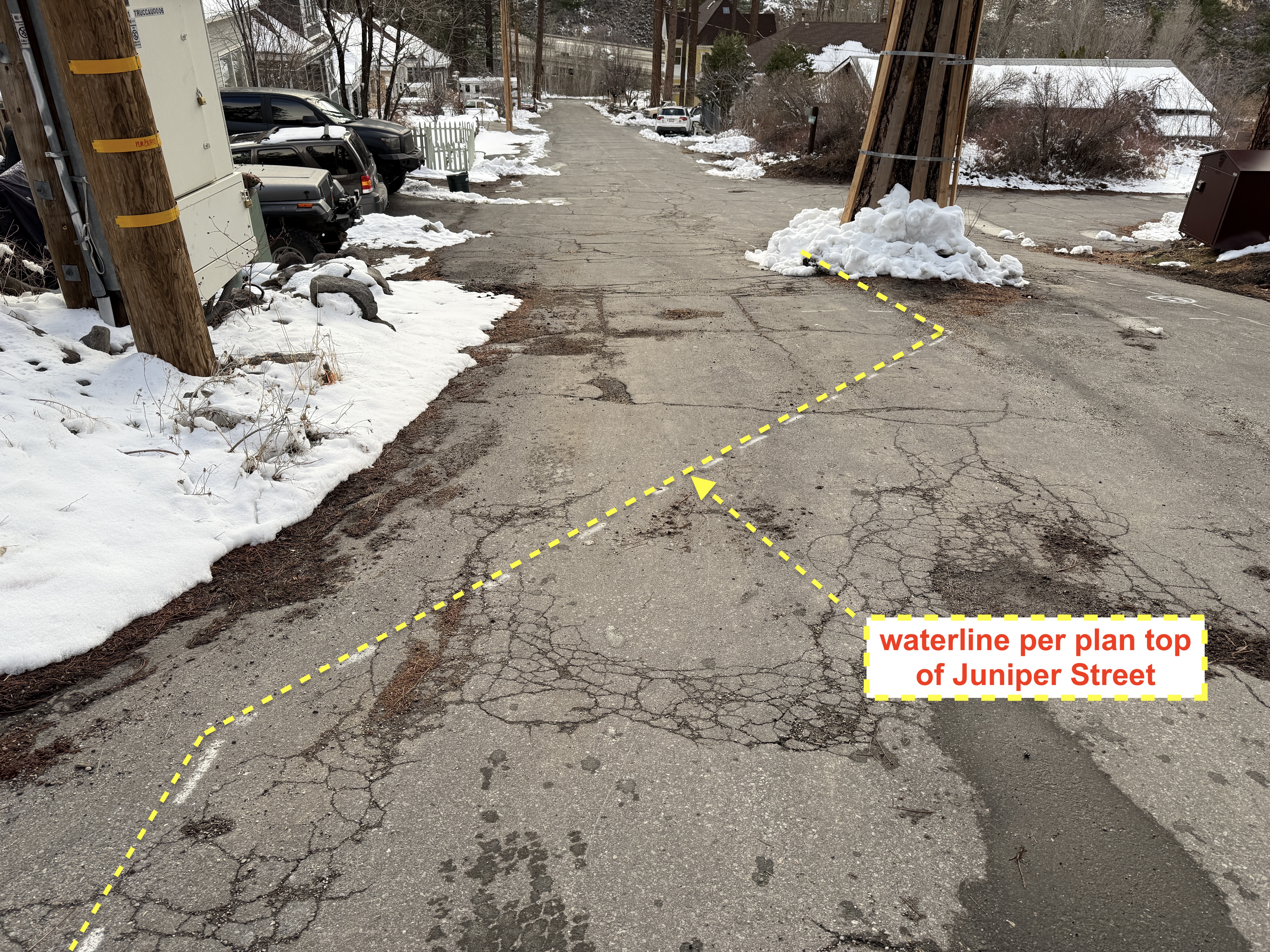 The image depicts a cracked asphalt road with snow covering its sides in Floriston, CA. A dashed yellow line is overlaid on the pavement, presumably indicating the planned path of a waterline as referenced in a label. Several vehicles and utility poles are visible along the street. The overall setting suggests a cold climate with the presence of snow.