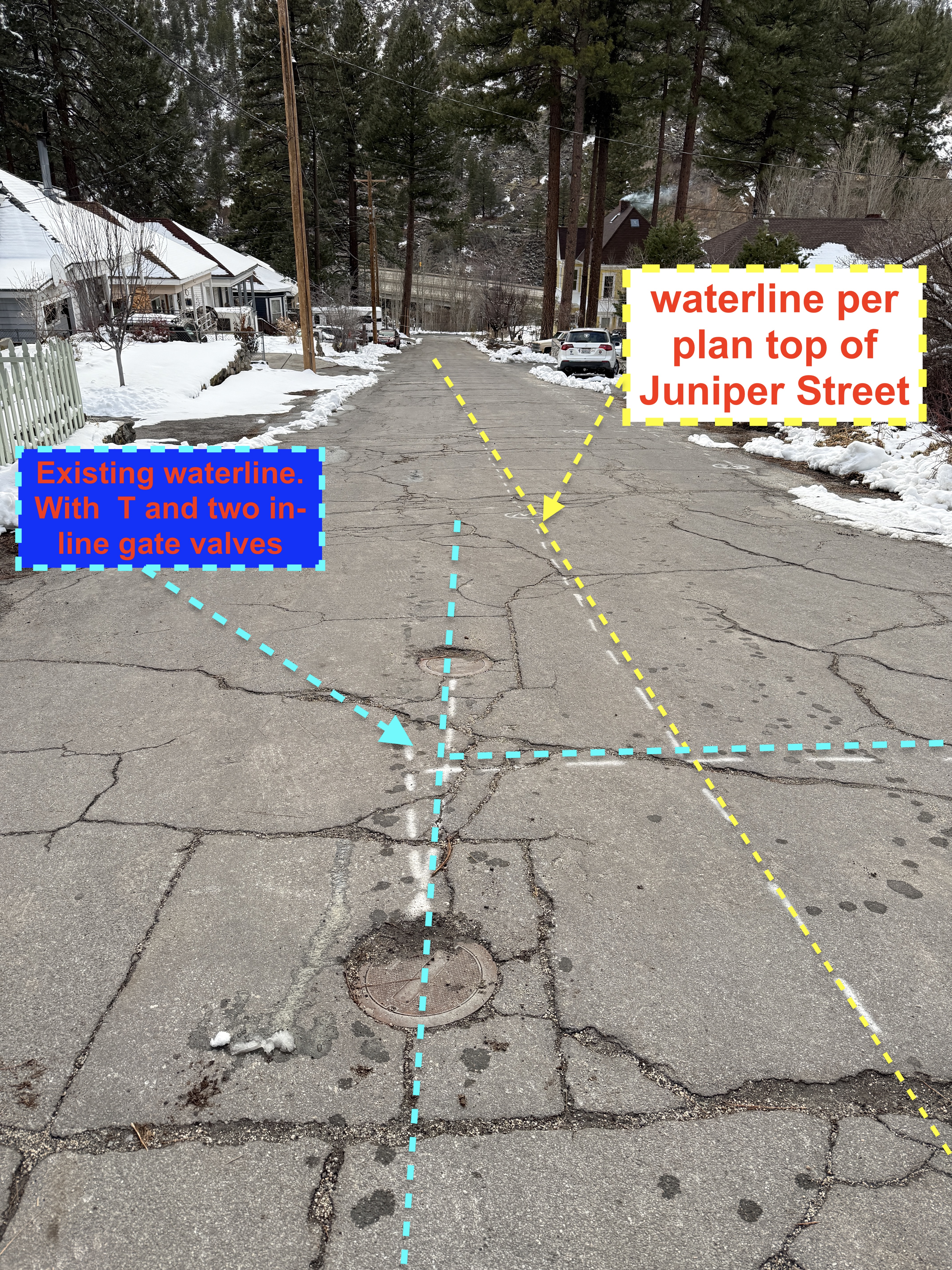 The image displays a section of Juniper Street with markings indicating an existing waterline and a planned waterline. Blue dashed lines mark the existing waterline alignment with a 'T' and gate valves indicated. Yellow dashed lines suggest the planned waterline per plan. The street surface is covered with snow indicating cold weather conditions.