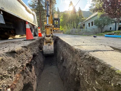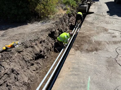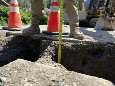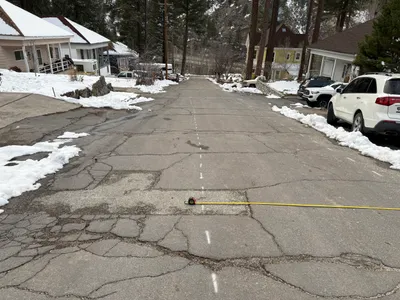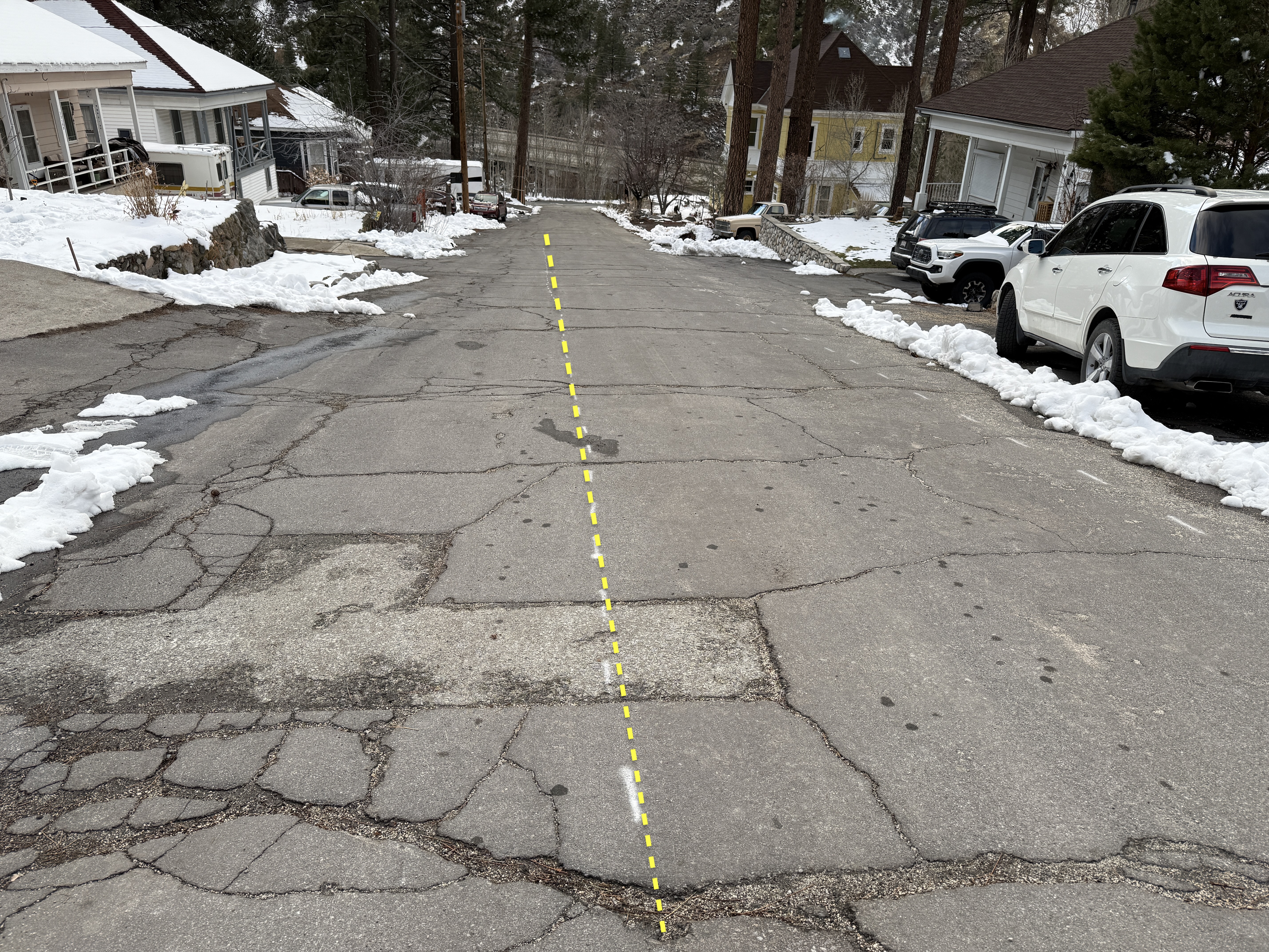 The image shows a street with a significant number of cracks and patched areas on the asphalt surface. There is snow accumulated along the edges of the road and on the sidewalks. Yellow dashed lines appear to be a digital overlay, possibly indicating the centerline or waterline alignment. Vehicles are parked along the right side of the street.