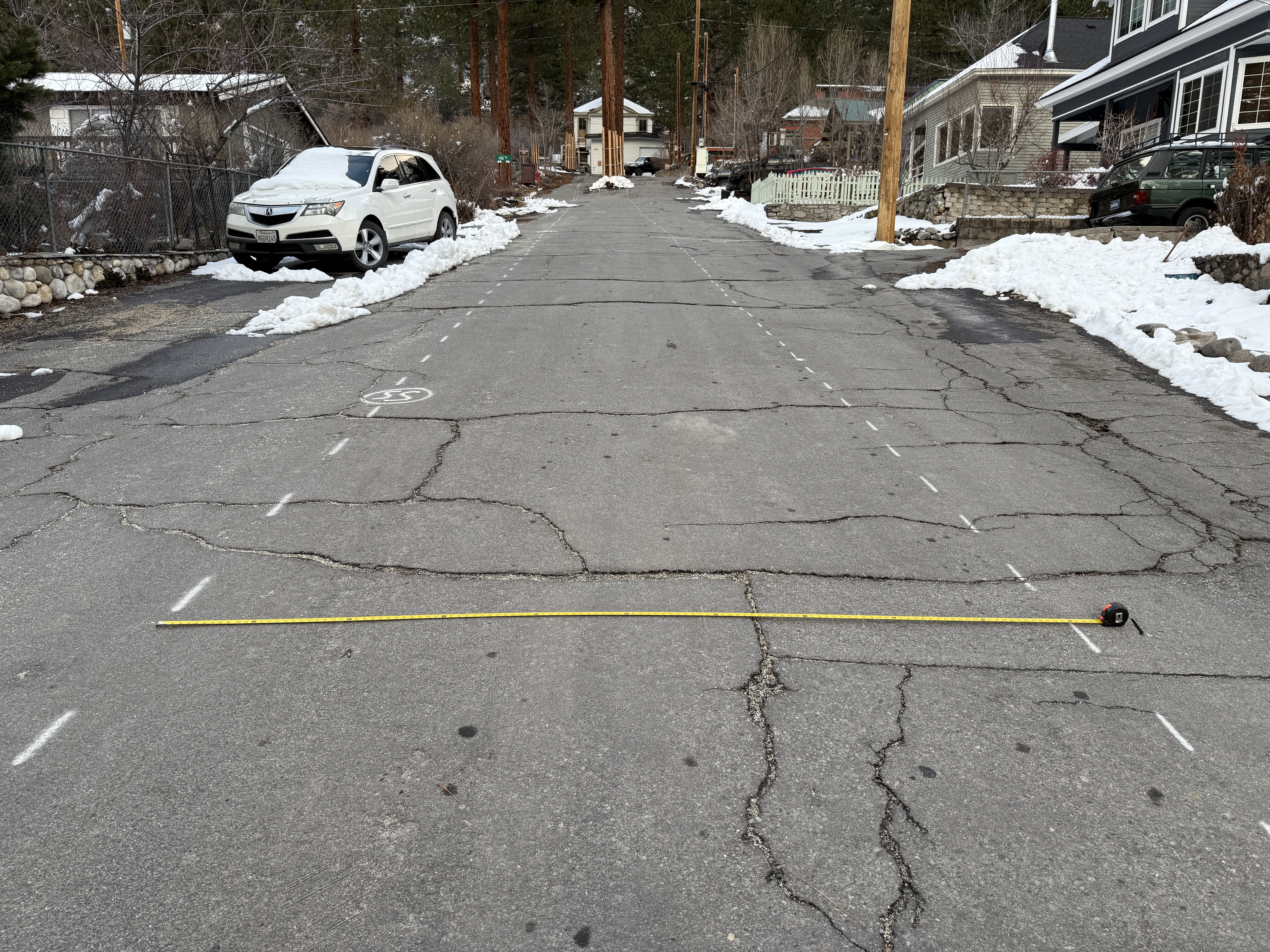 The image shows a measuring tape extended across a cracked residential street. There is snow on both sides of the road, with a white SUV parked to the left and other houses visible. White painted markings are visible on the road surface, likely indicating surveying or measurement activity.