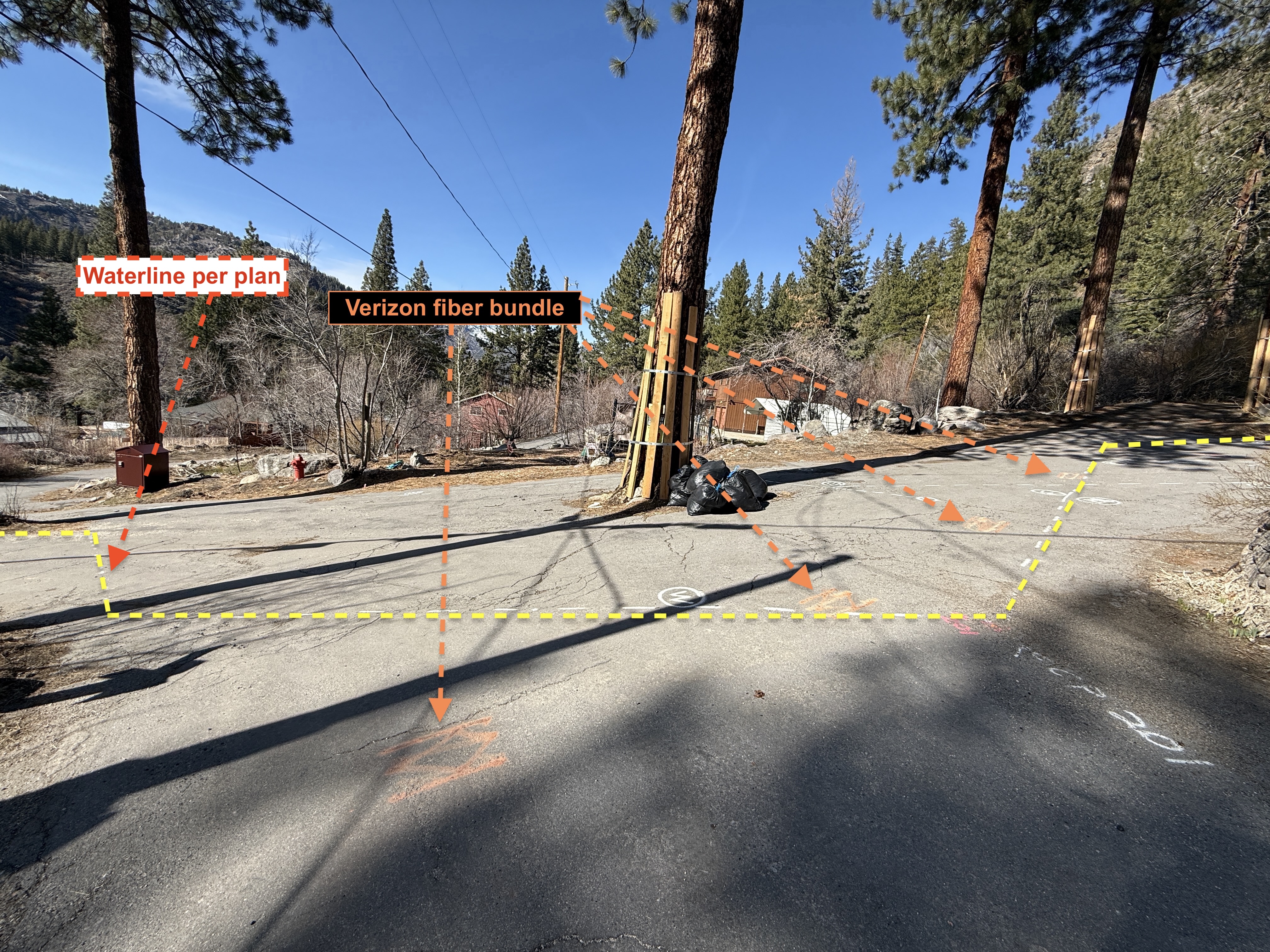 The photo displays several dashed lines marking a waterline and a Verizon fiber bundle on a paved street surrounded by trees. The markings are painted on the pavement, indicating the alignment of the utilities. The terrain is clear, with trees supporting overhead cables. Bags are visible near one of the utility lines.