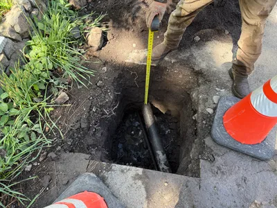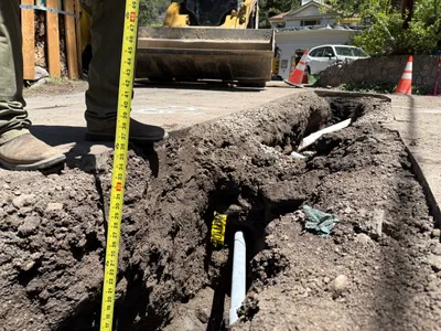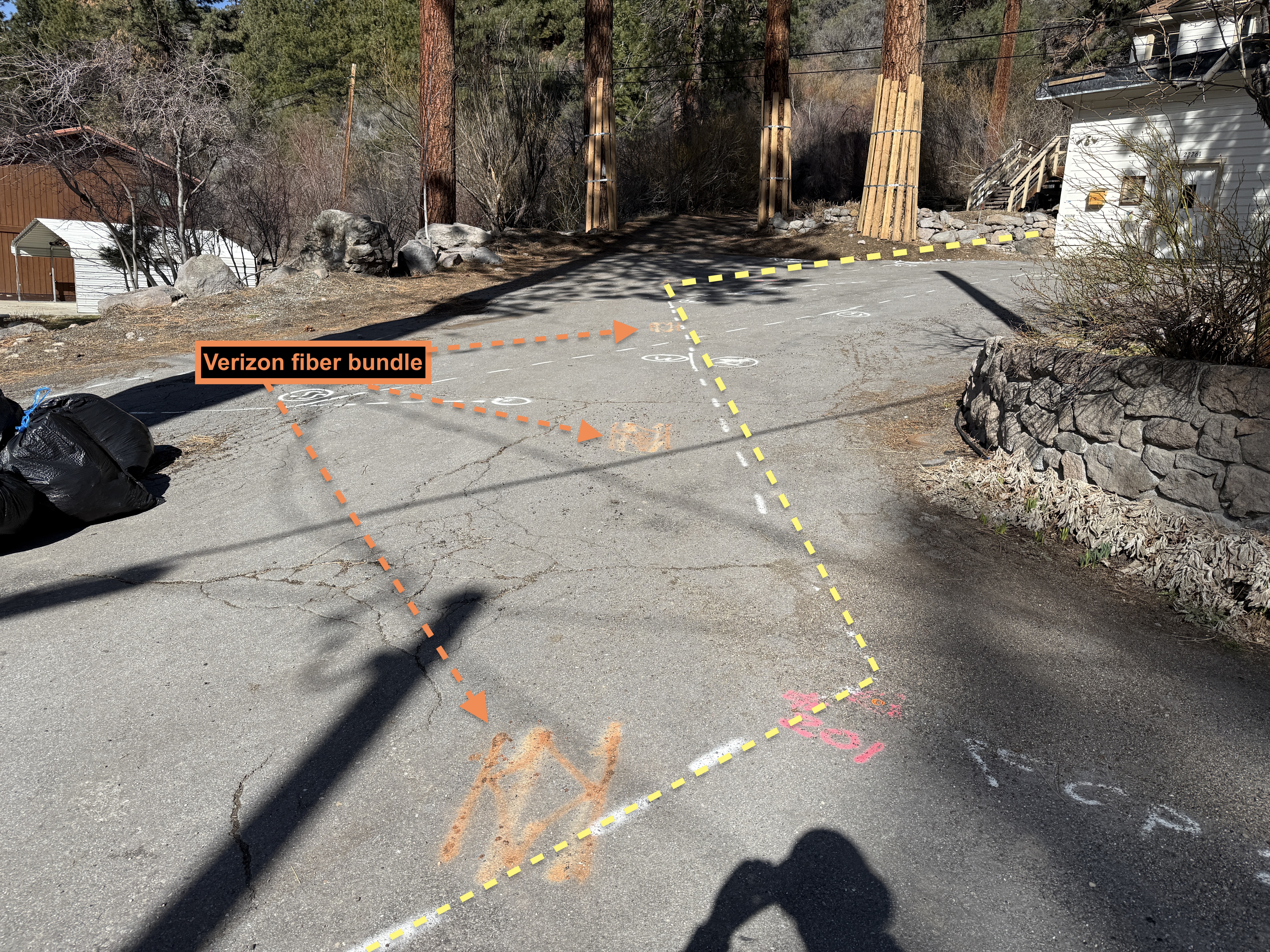 The image shows a paved surface with colored markings indicating alignment paths. Orange spray paint notes a 'Verizon fiber bundle', while other markings suggest waterline alignments. A shadow is visible on the pavement, and a stone wall runs along the right side.