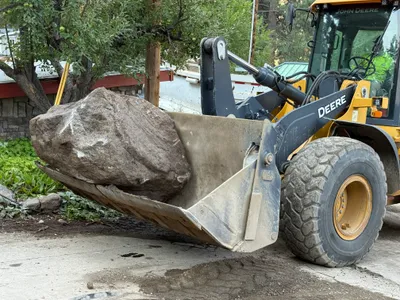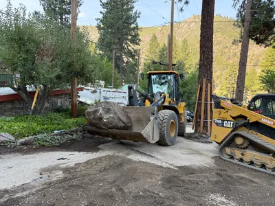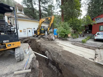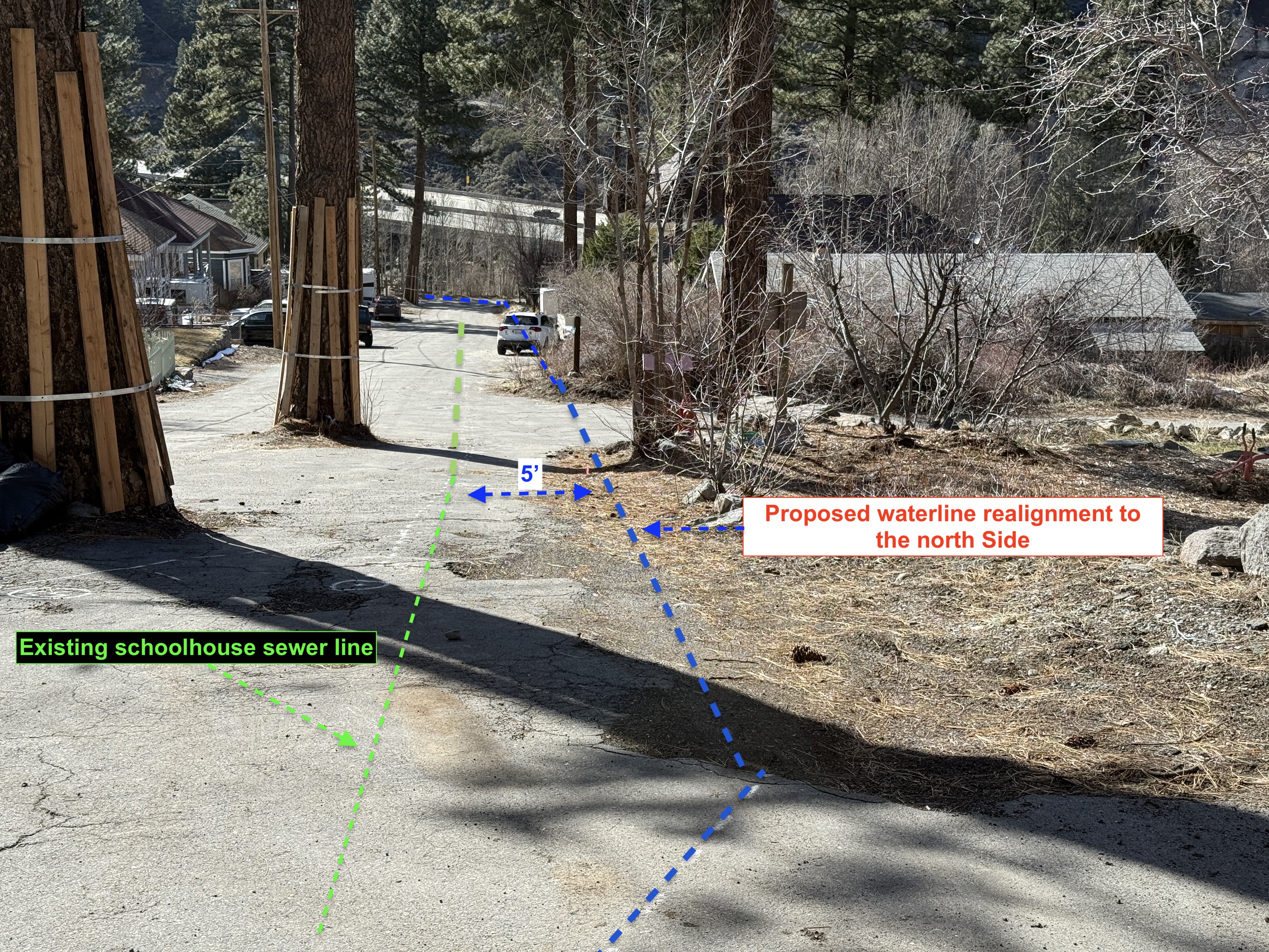 The image shows a proposed waterline realignment marked with a blue dashed line to the north side of Juniper Street. Green dashed lines indicate the location of the existing schoolhouse sewer line. The trees along the road are protected with wooden slats, and some houses are visible in the background, indicating a residential area.