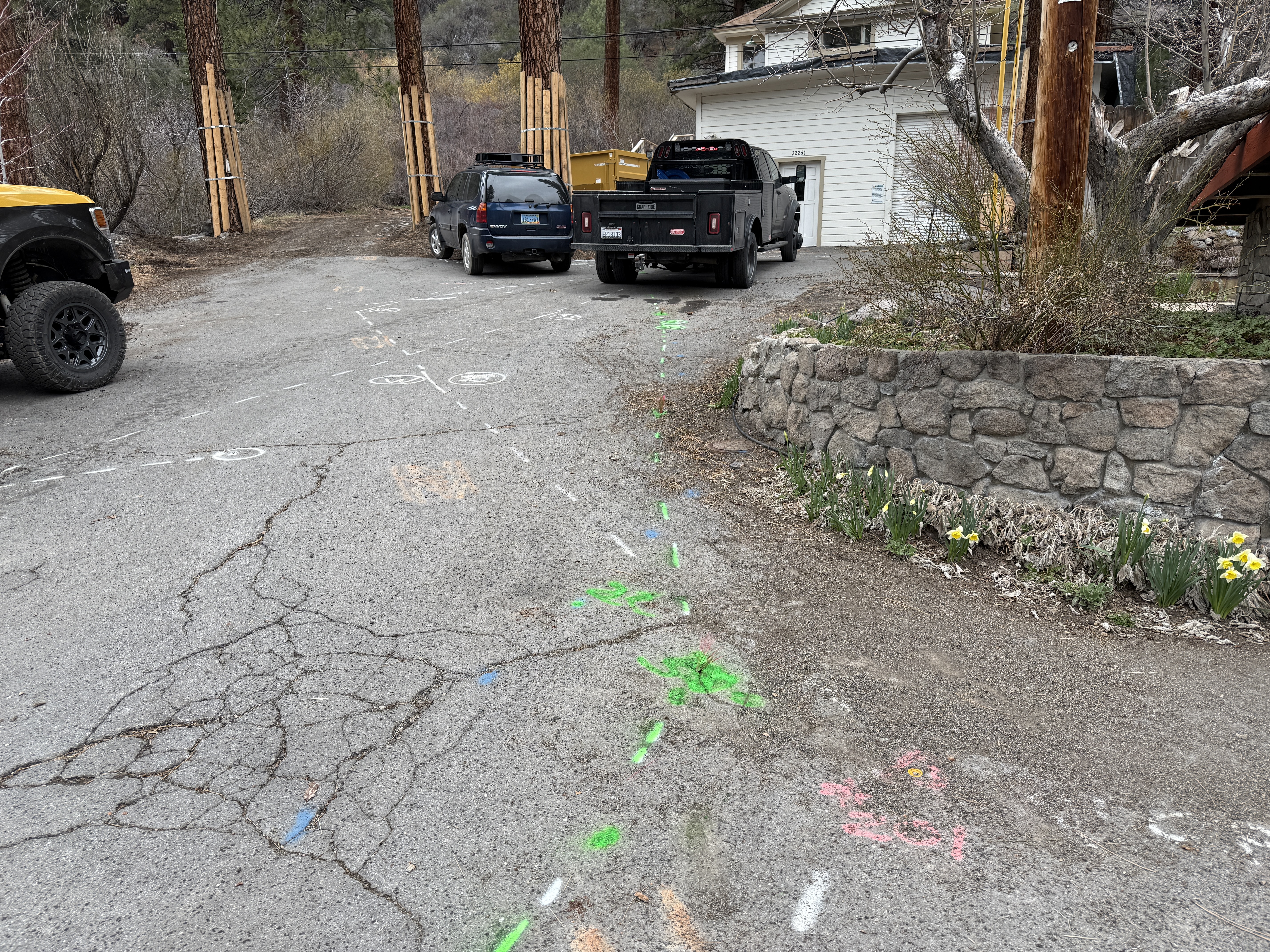 The image shows a cracked asphalt pavement with multiple spray-painted markings, which are often used for indicating utility lines or planning excavations. Two vehicles are parked near the building, and the adjacent area includes a stone retaining wall and some greenery. There are no visible signs suggesting active work taking place immediately.