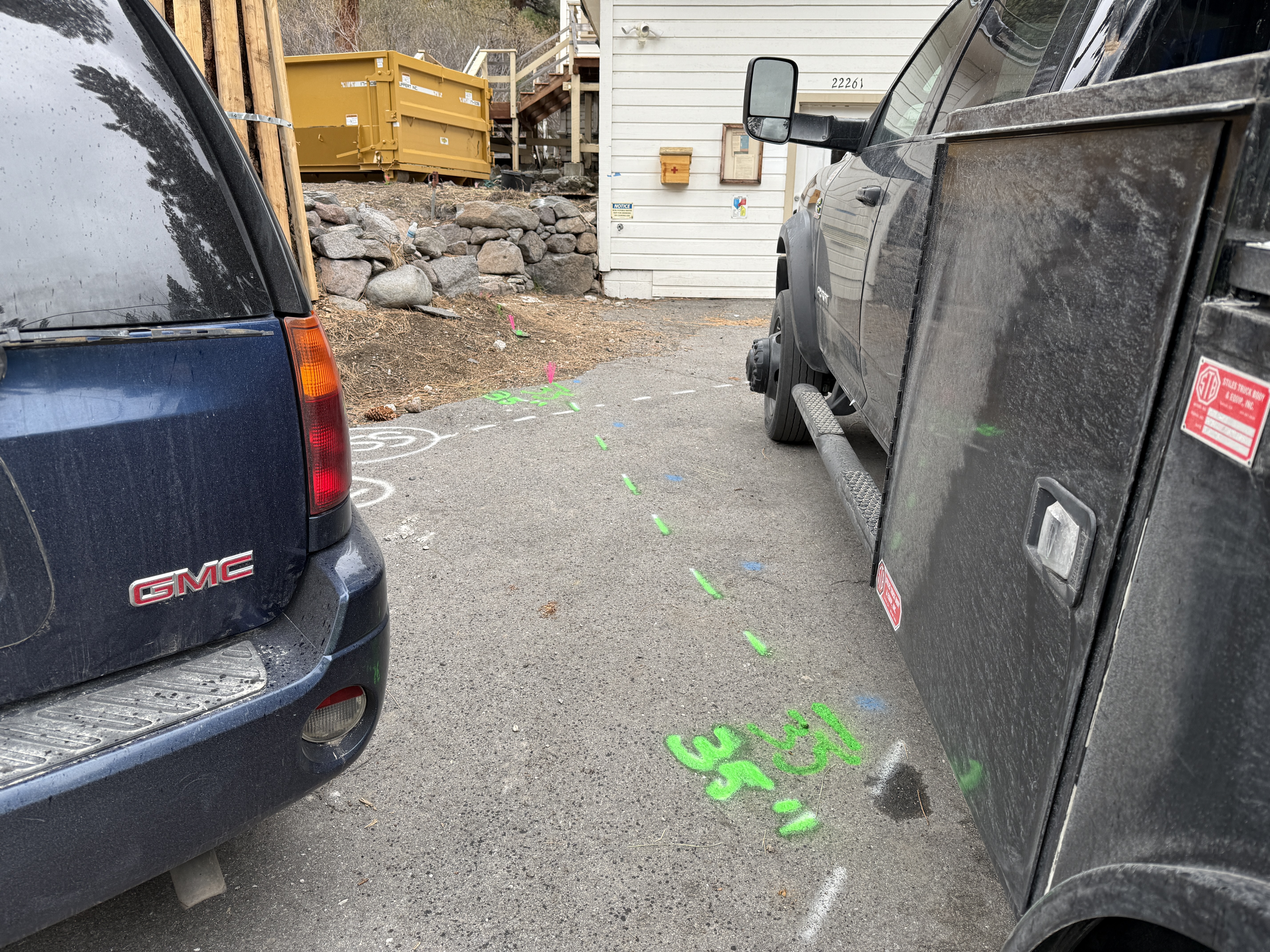 Green and blue spray-painted markings are visible on a paved surface between a GMC vehicle and a utility truck. The markings likely indicate underground utilities or planned excavation for waterline alignment. Nearby, construction materials and equipment suggest ongoing or upcoming work.