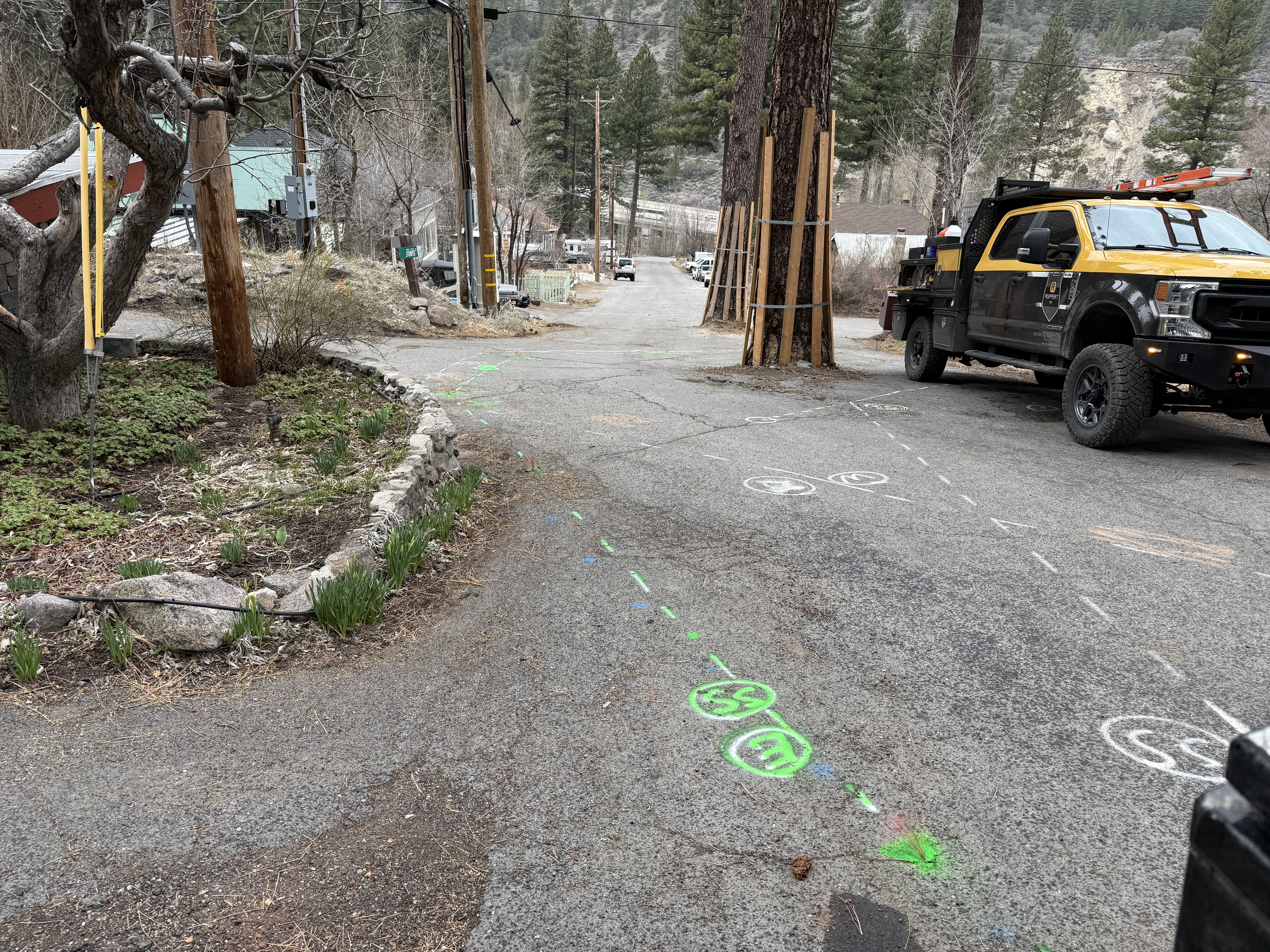 On a paved roadway, there are various colored utility markings indicating underground utilities. A pickup truck with equipment is parked to the right. Utility poles are present to the left and right of the image, and there is some vegetation by the side of the road. The area appears to be a residential or rural street with slight elevation changes.