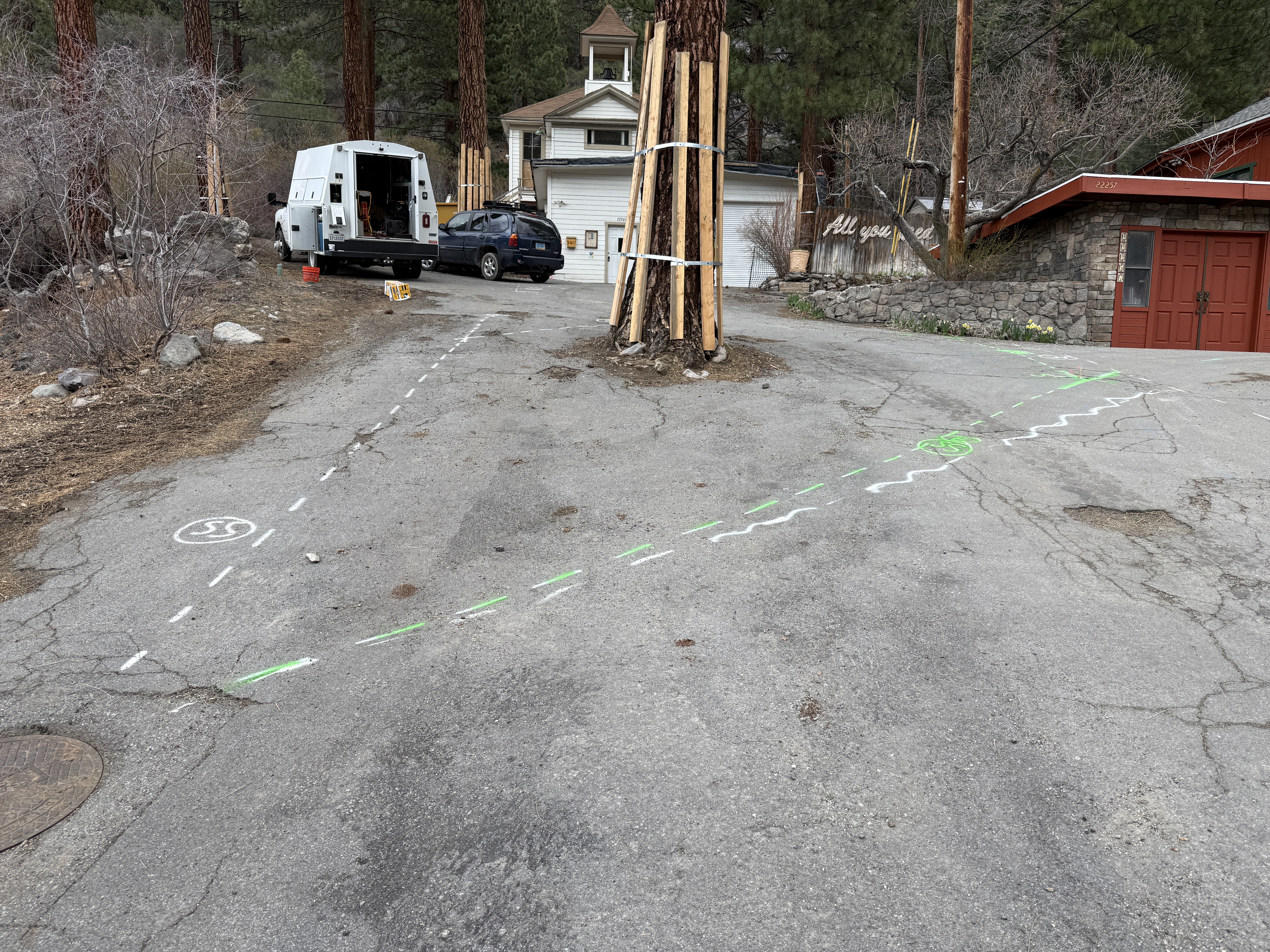 The photo captures pavement with painted markings possibly indicating waterline alignment work. A white van, a parked car, and tree protection structures can be seen. There are no visible signs of active construction work such as trenching or digging. The ground appears to have markings that might relate to a waterline project.
