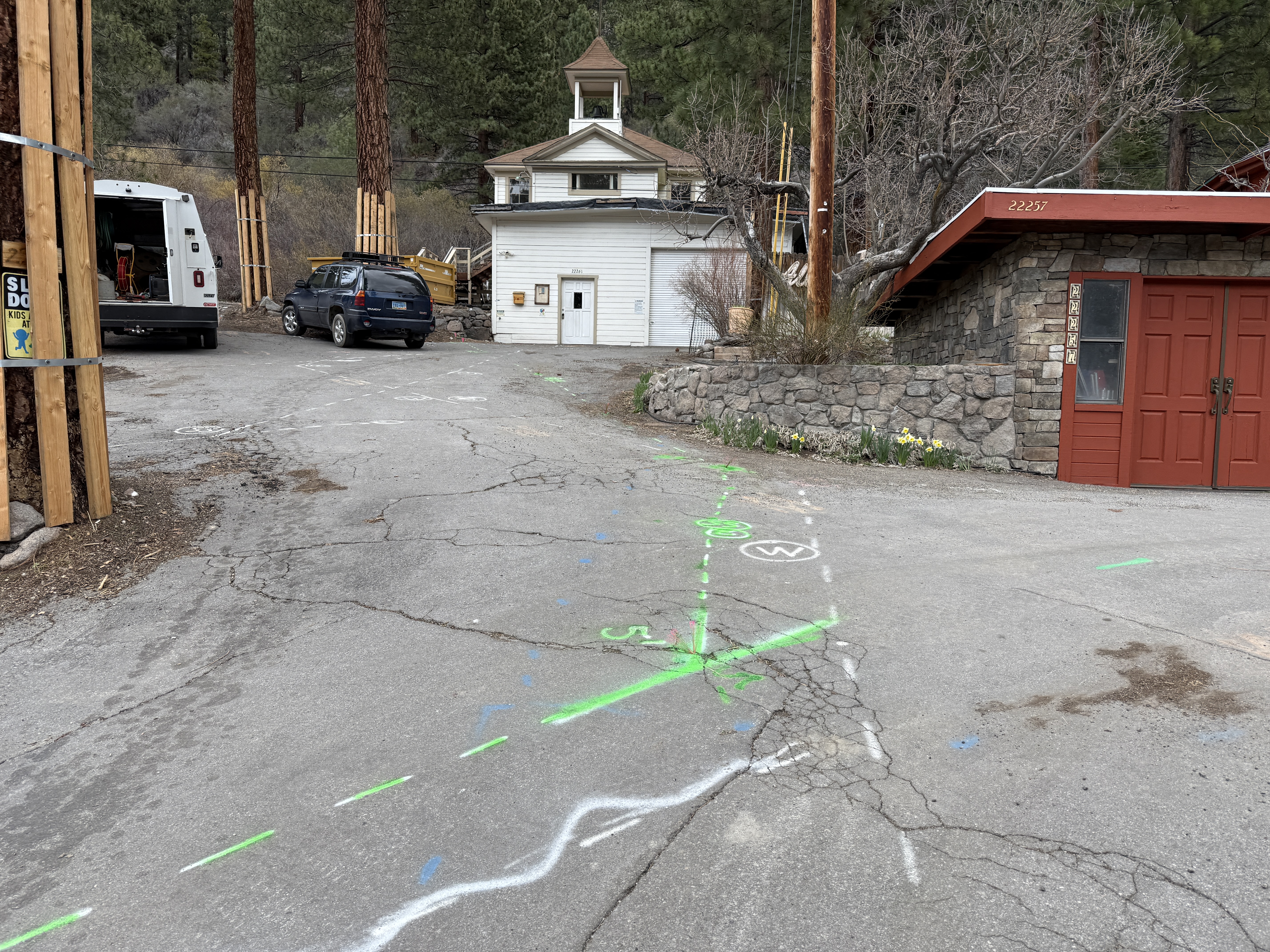 There are green and white utility markings on cracked pavement, indicating potential underground work. A white van and a blue SUV are parked nearby. A small building with a white exterior is visible behind the vehicles. The area is surrounded by trees, and there is a red stone building on the right.