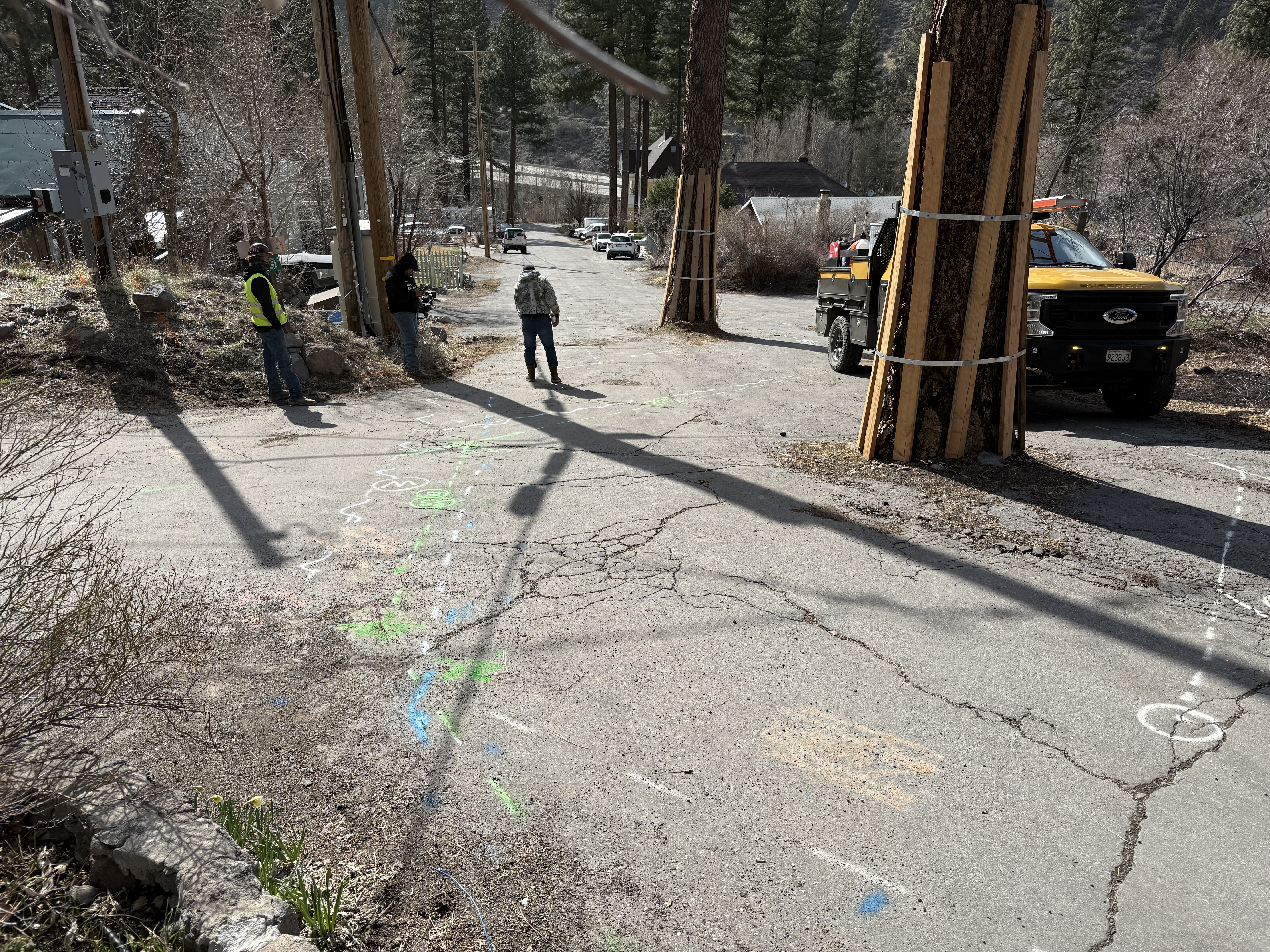 The image shows utility markings on a cracked asphalt road, with three individuals beside utility poles. A truck is on the road, near trees with protective wooden planks. Brightly colored markings indicate underground utilities across the pavement.