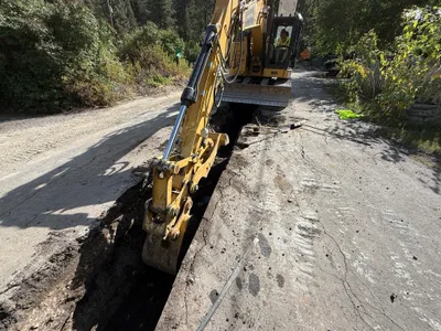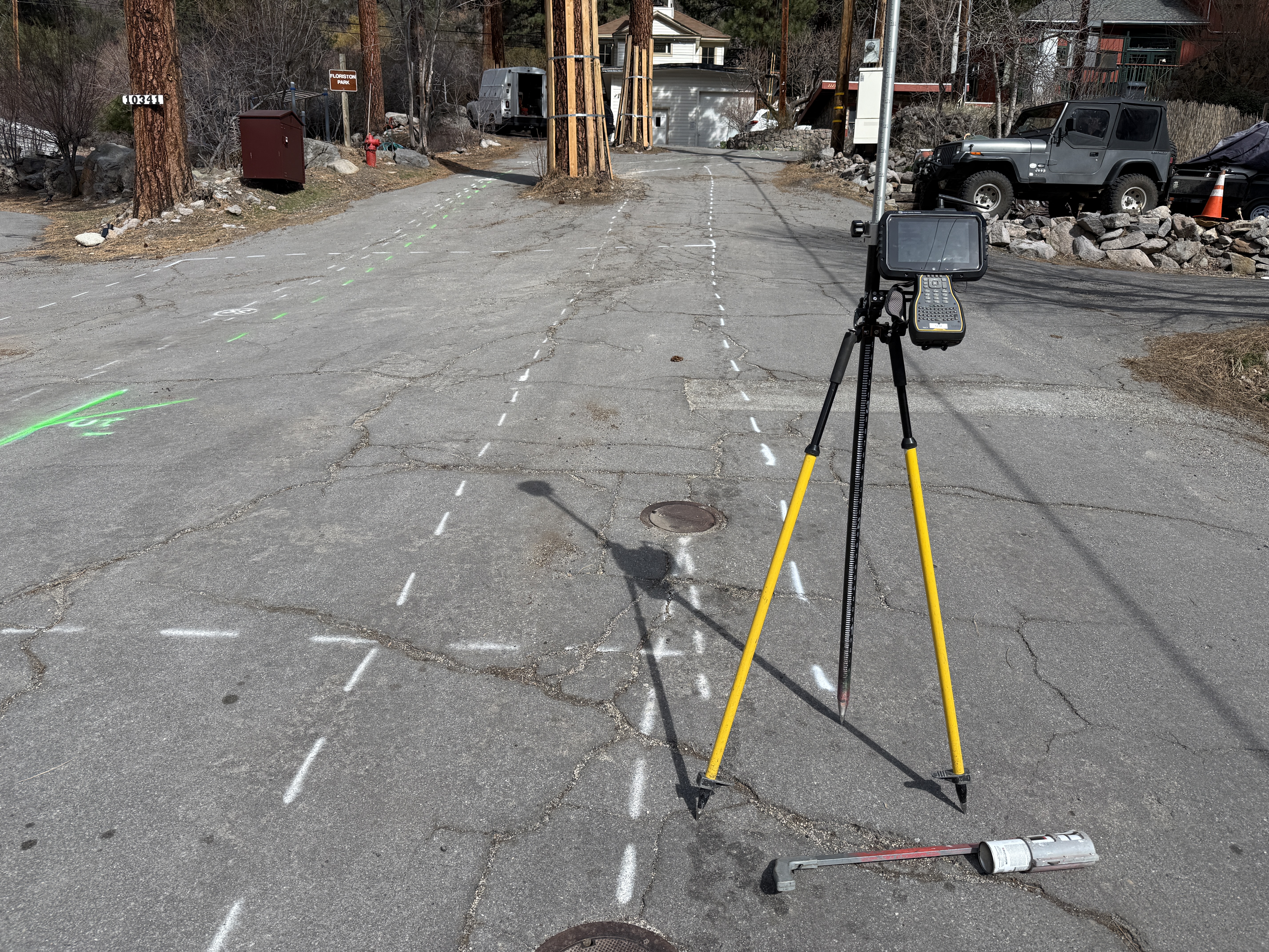 paved road with spray paint markings clear daylight road is unobstructed with survey equipment in place