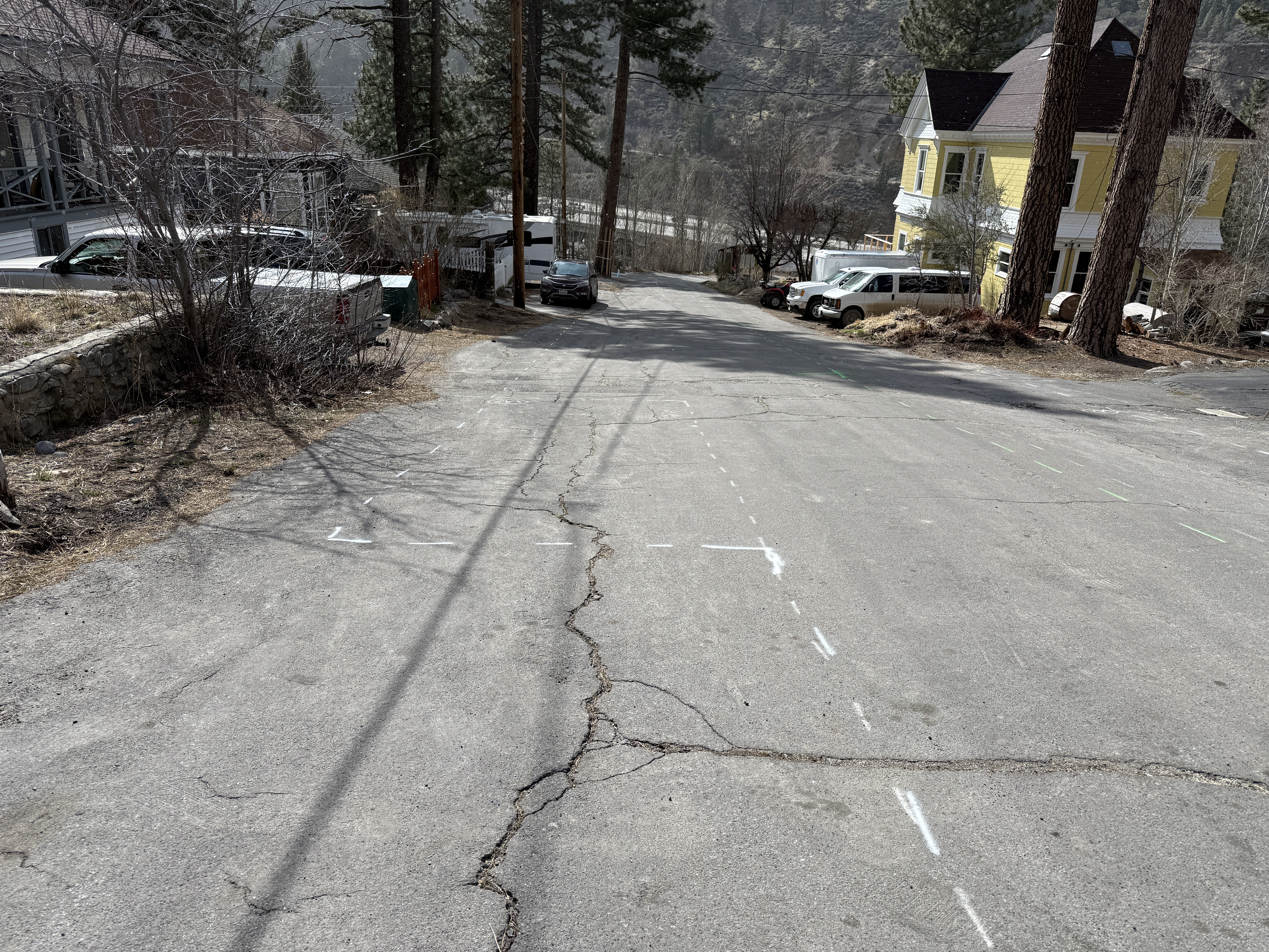 The image shows a street with white dashed lines and markings likely indicating survey or alignment points. The pavement is cracked, and several vehicles are parked along the sides. There is no active construction work or equipment visible. The area appears to be quiet and lacks immediate activity.