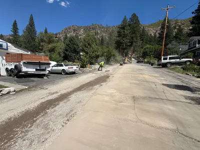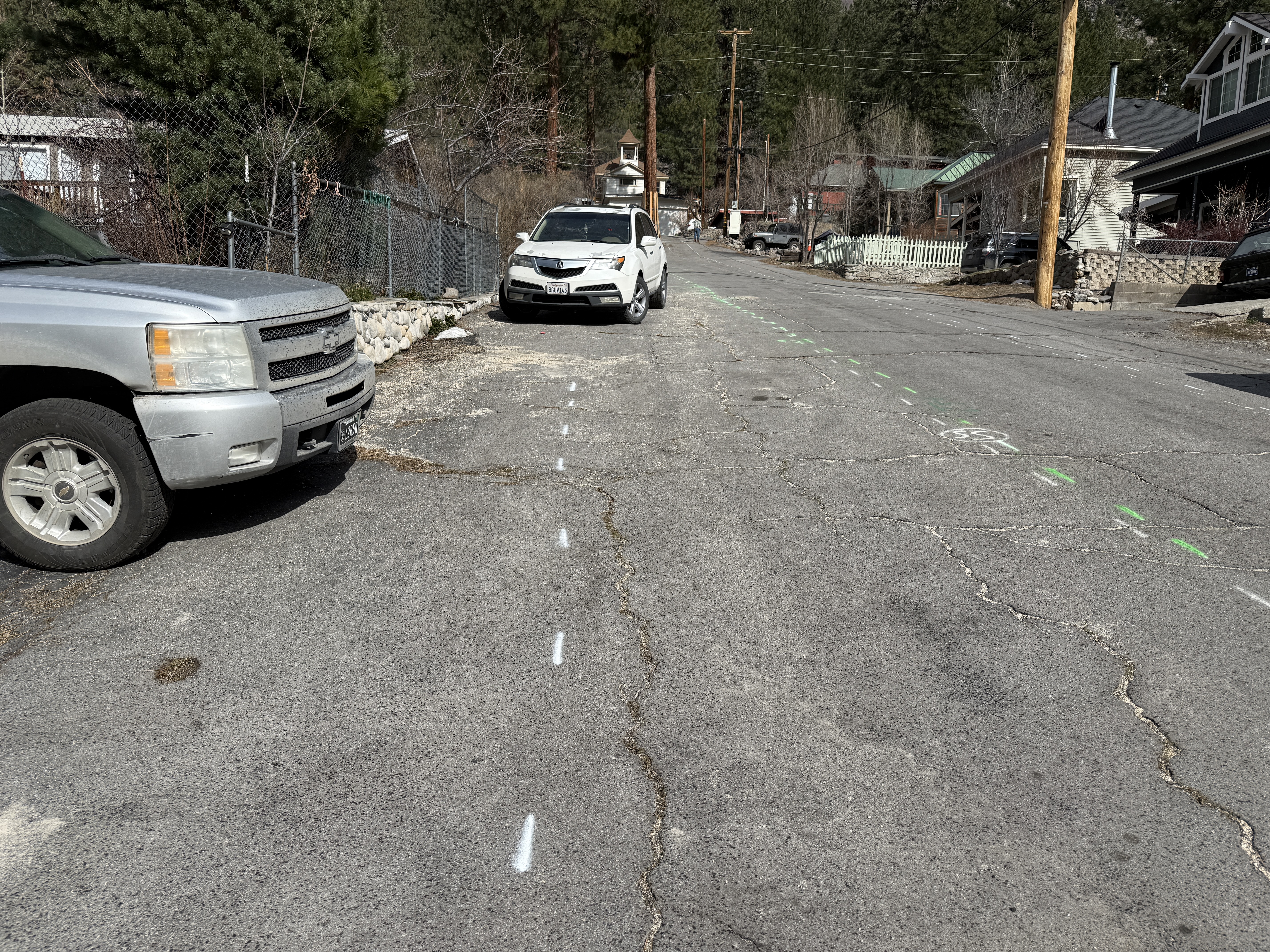 Two vehicles are parked on a street with visible cracks and markings, indicating potential locations for future work. The street is lined with residential properties and there are green and white spray-painted lines and symbols on the pavement. These may denote planned work areas for a waterline project.