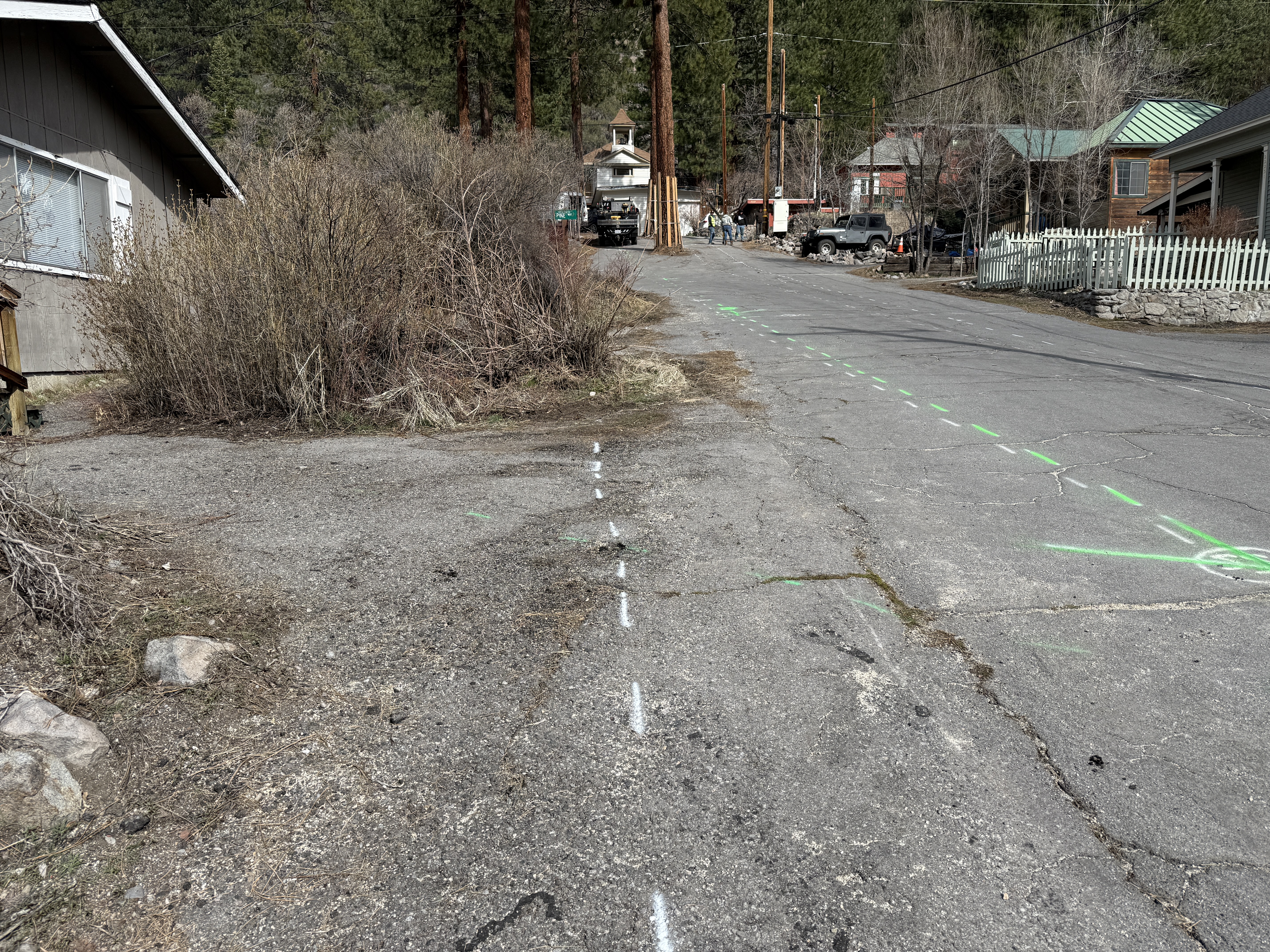The image shows green and white street markings on a paved road, likely indicating alignment for a future waterline installation. Vegetation and a residential structure are visible on the left side of the road, while a picket fence runs parallel on the right. The scene includes nearby residential houses and power lines overhead. No active construction equipment or personnel are in view.