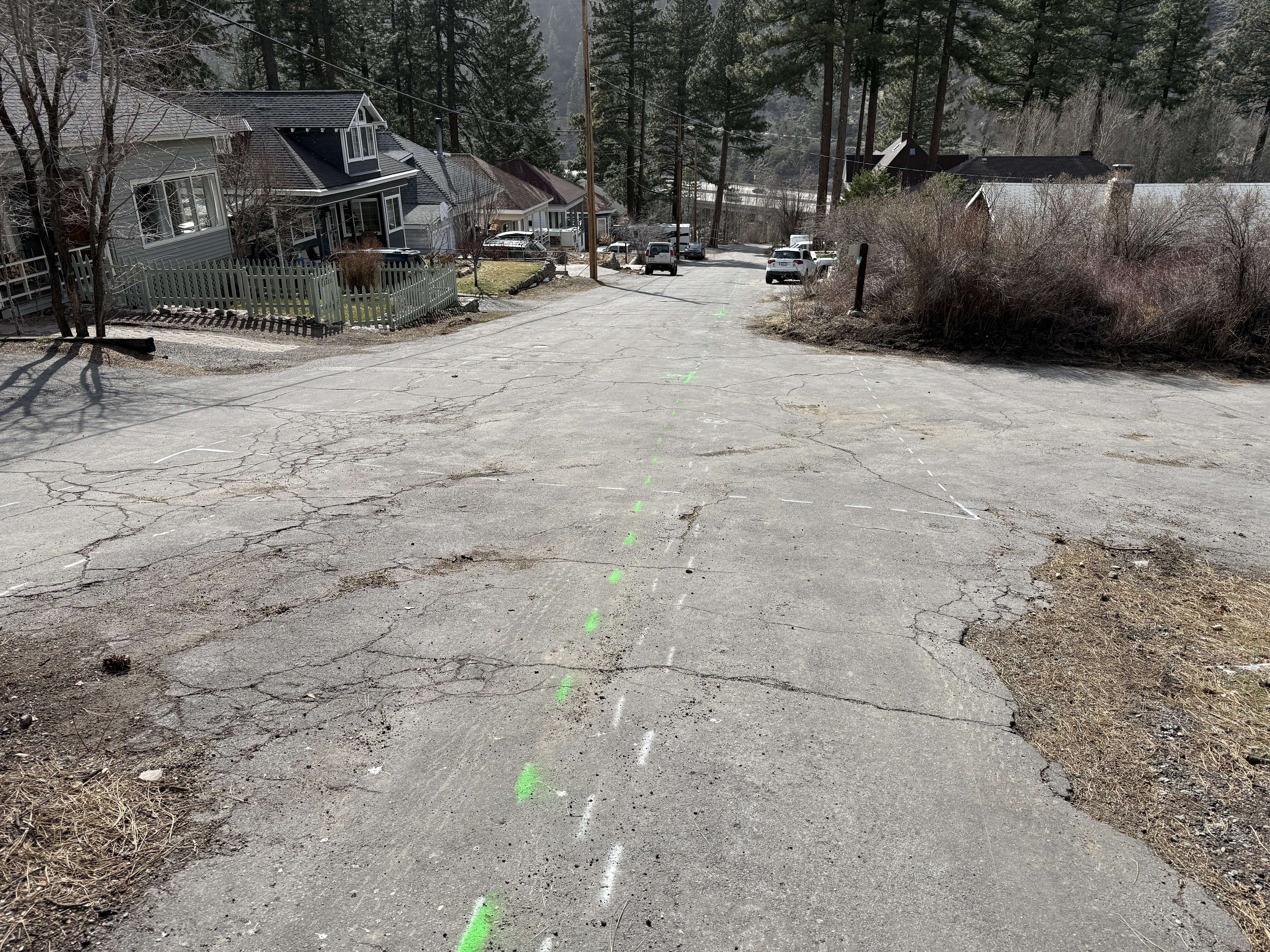 The image captures a cracked and worn road surface with prominent green and white painted lines running along its center, likely indicating a utility alignment or construction path. The lines are visible on Juniper Street, which features residential housing on the left and right sides. Several vehicles are parked along the street, and trees are visible in the background.