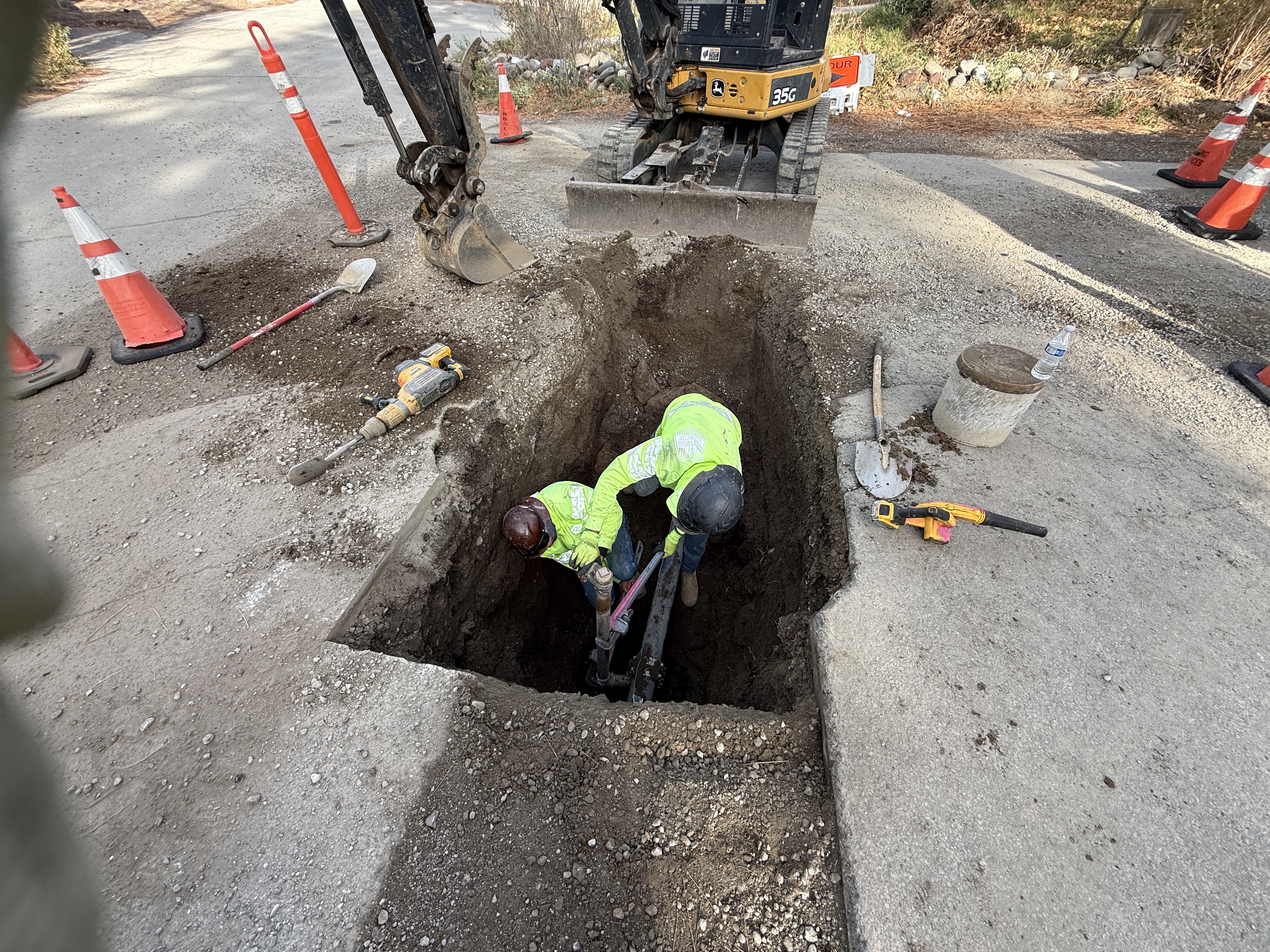 Personal protective equipment is worn, and safety cones mark the work area, but no trench box is visible.