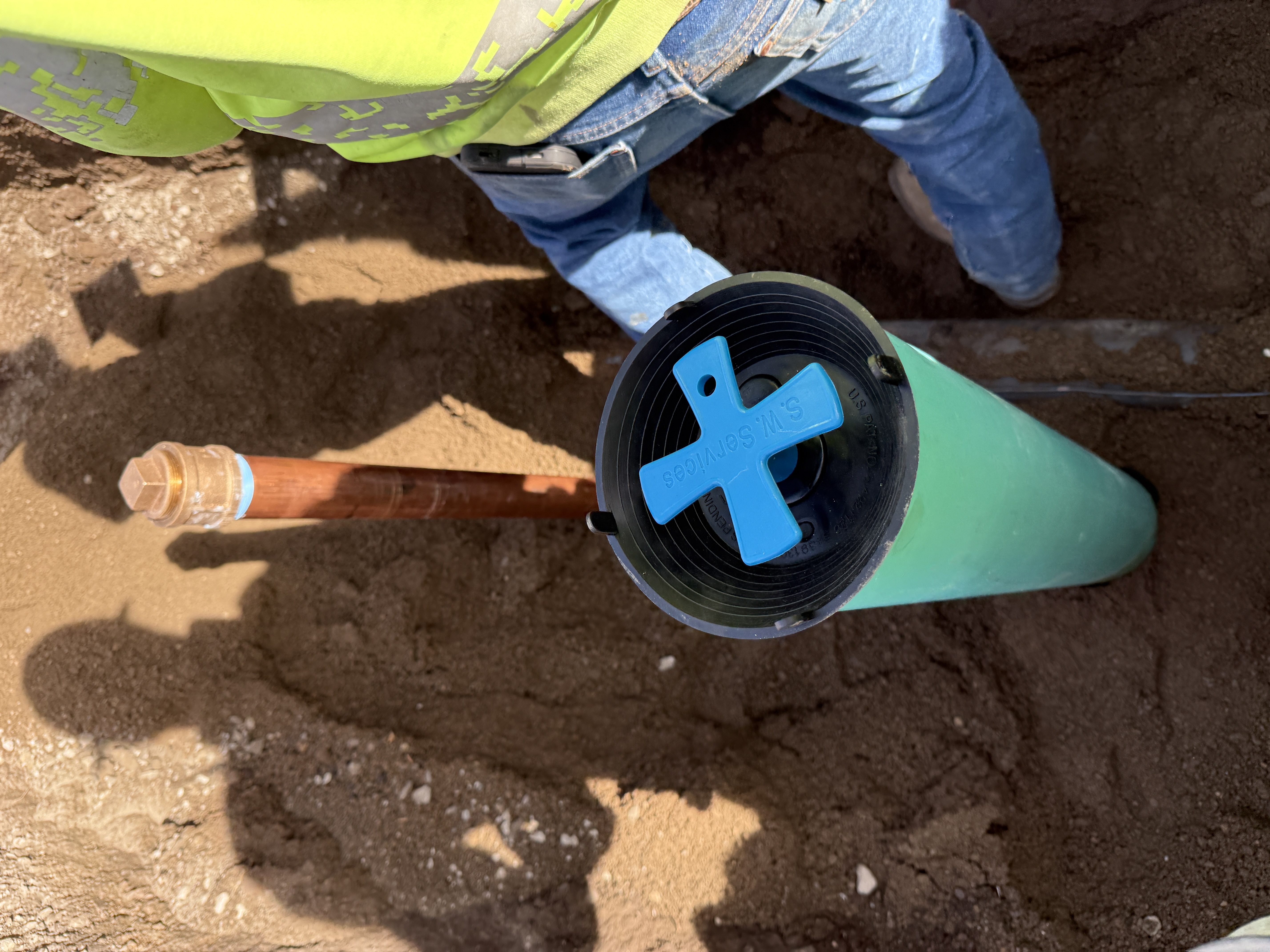 The image shows a construction site where a green pipe with a blue cross-shaped cap is centrally positioned in an open trench. Next to it is a brown vertical pipe with a coupling at the top. A worker wearing a hi-vis vest and jeans is partially visible on the right side of the image. The trench is filled with soil, and shadows of the photographer and another person are cast on the ground.