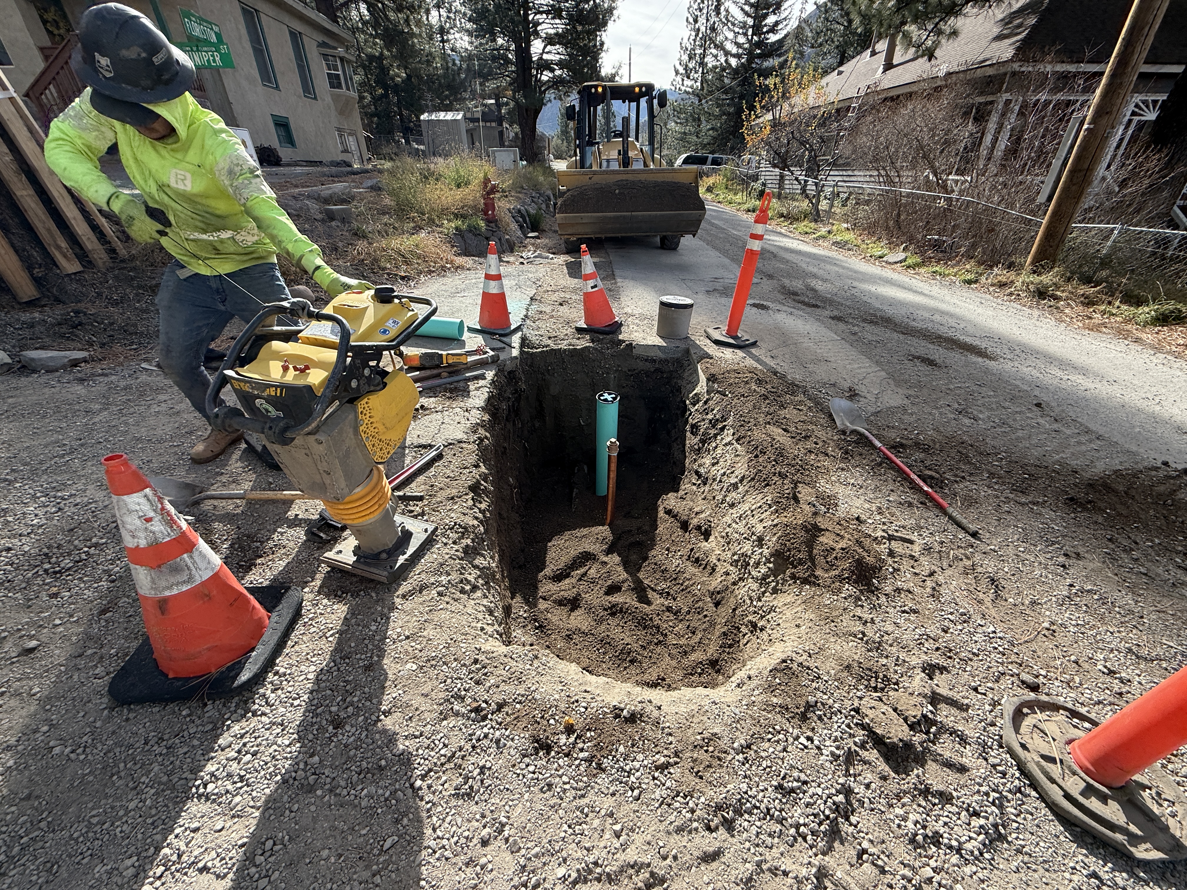A worker is operating a compactor at a trench in a roadway, surrounded by traffic cones. There is a visible pile of excavated soil beside the trench, and a shovel is lying on the ground. A pipe protrudes from inside the trench.