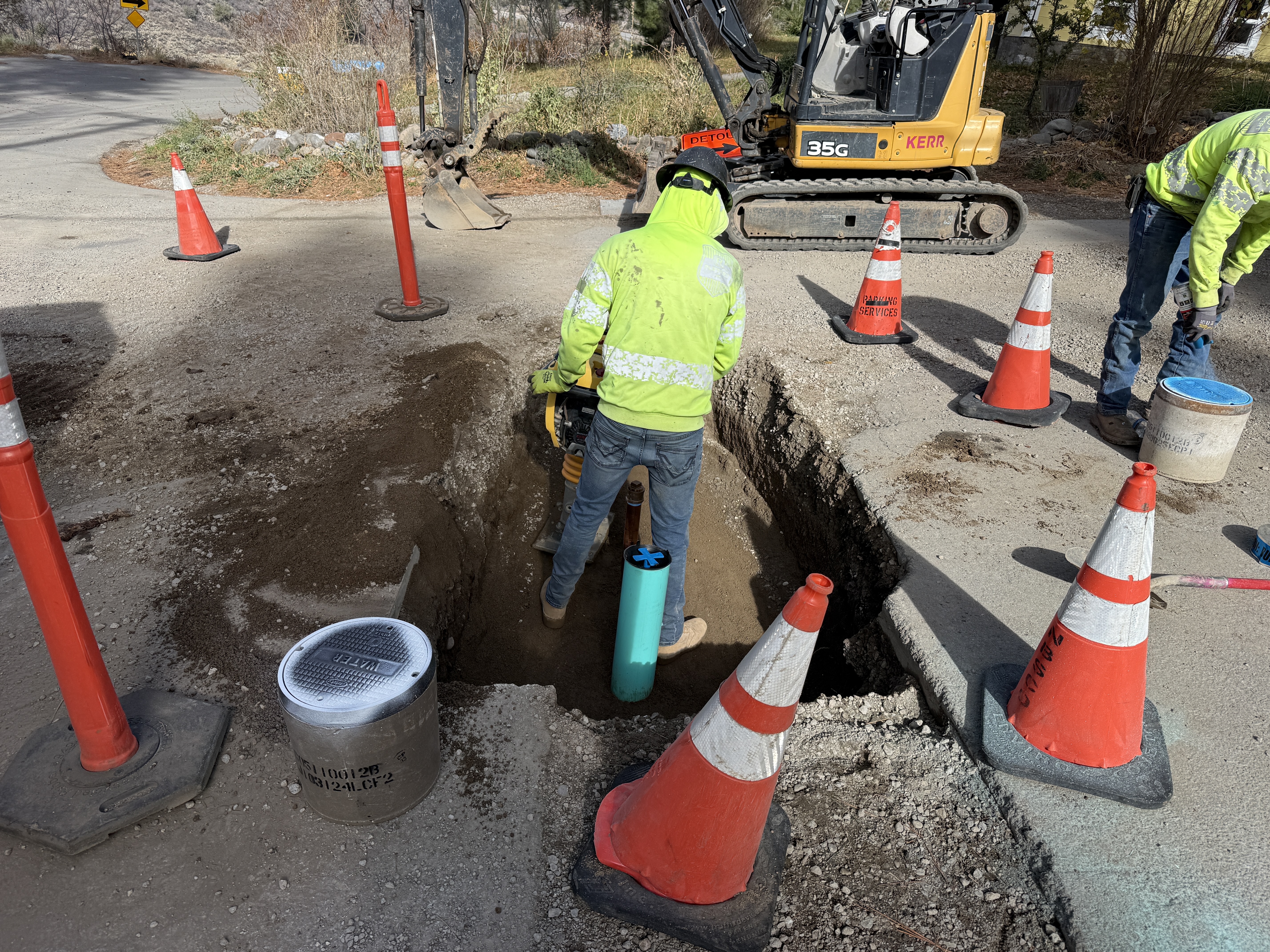 A worker in a hi-vis jacket is inside a trench, operating a compactor on the soil. There are safety cones placed around the trench in a dirt road area with some visible paving and a small excavator in the background. A blue pipe is seen vertically in the trench, suggesting recent installation or inspection work. The area is designated for pipeline maintenance or installation.