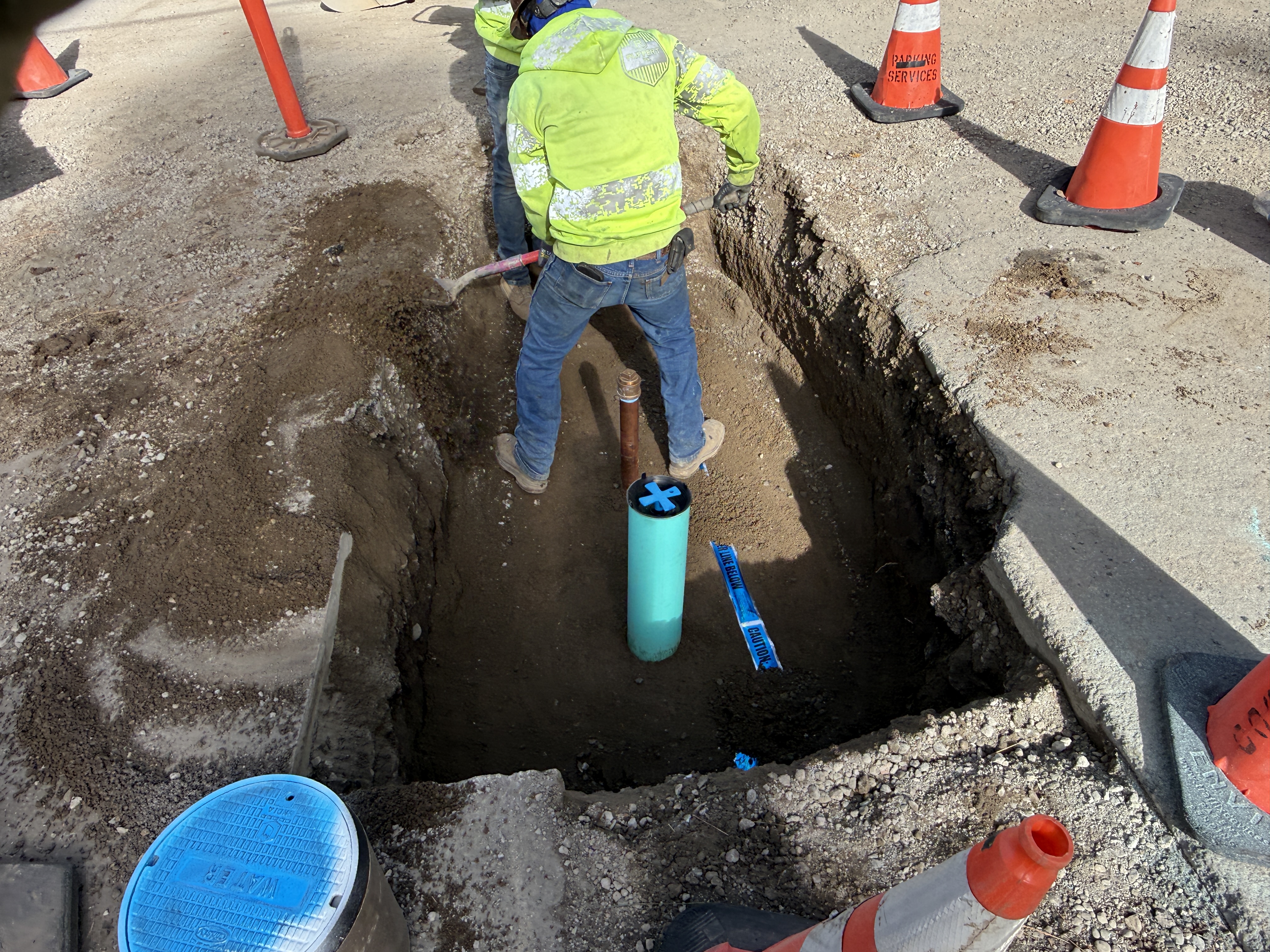 Two workers are engaged in trench work, digging near visible orange safety cones. There is a blue pipe, possibly indicating a waterline, and soil being moved inside a trench. The workers are wearing appropriate PPE, including hi-vis vests. Safety measures such as cones are in place to mark the work area.