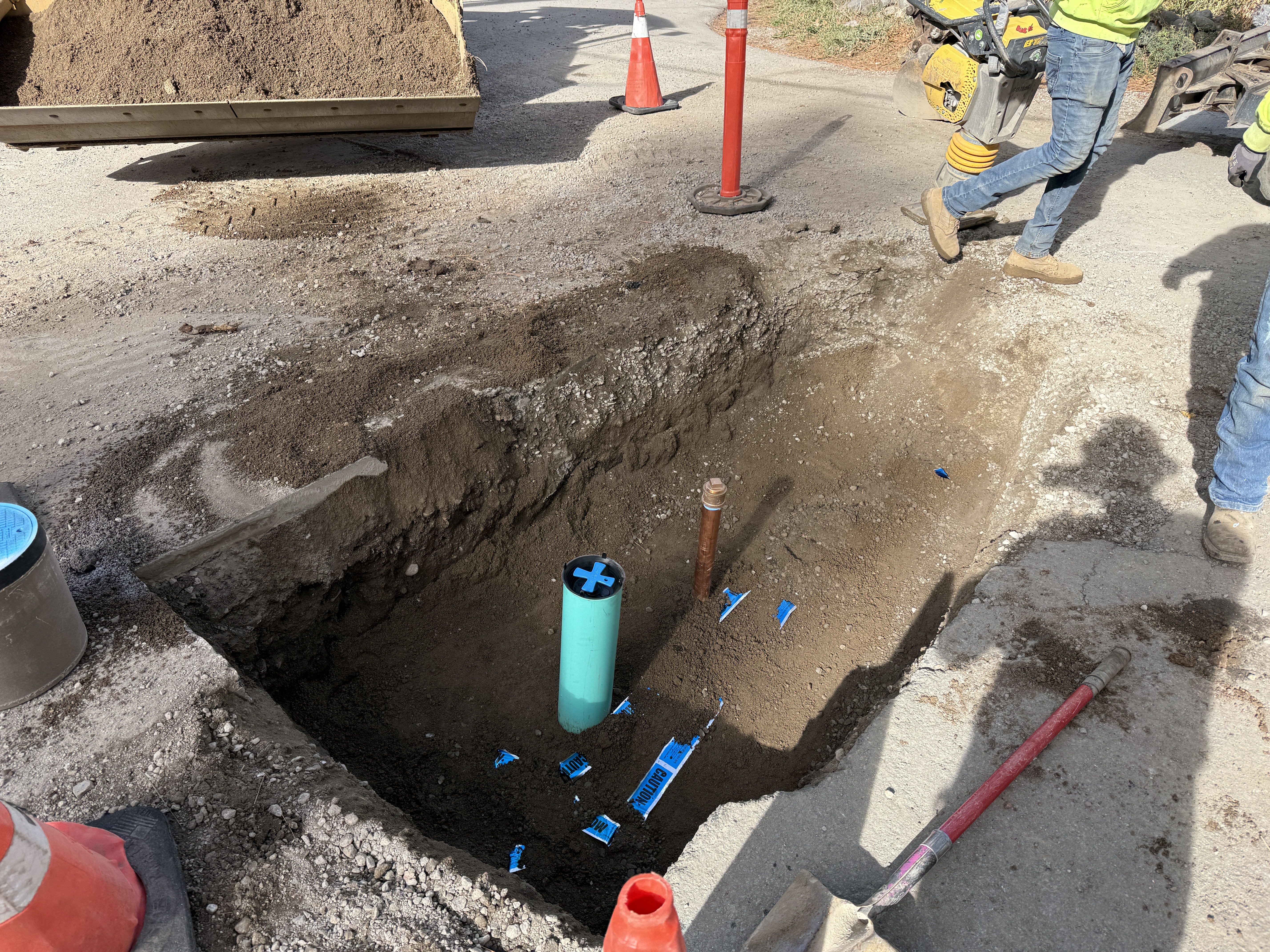 The image shows an open trench on a paved surface, with a blue pipe and a copper pipe protruding from the ground. Loose soil is seen in a pile nearby, along with several safety cones marking the area. Workers in safety gear are visible around the site.