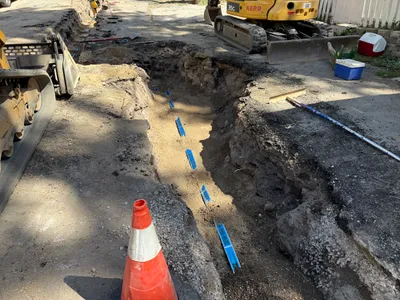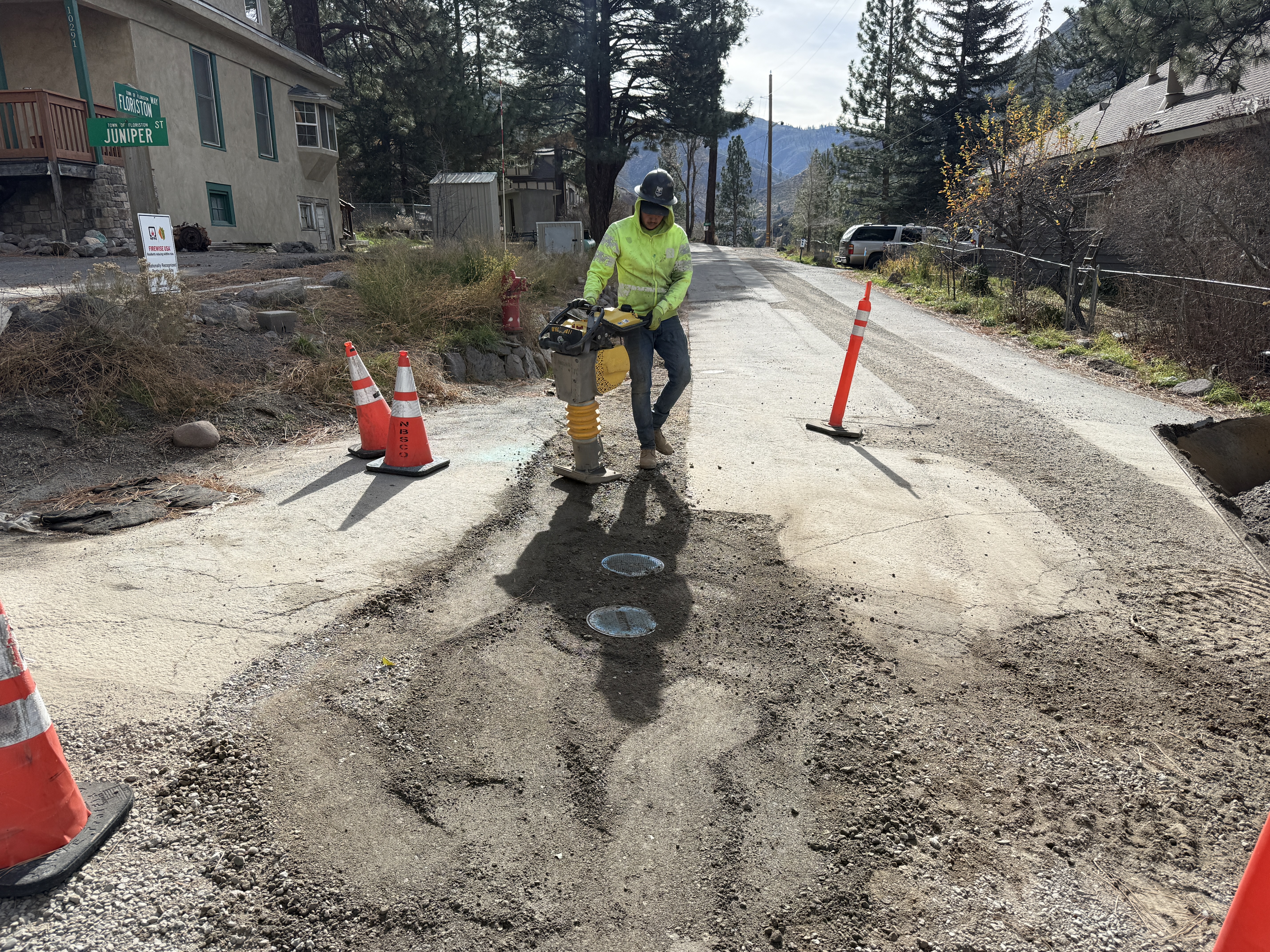 The image shows a worker operating a soil compactor on a partially dug-up road. Several traffic cones are positioned around the work area indicating potential hazards. The worker is wearing PPE on a street with openings or filled trenches visible. The surrounding area includes residential buildings and trees, indicating a rural or suburban setting.