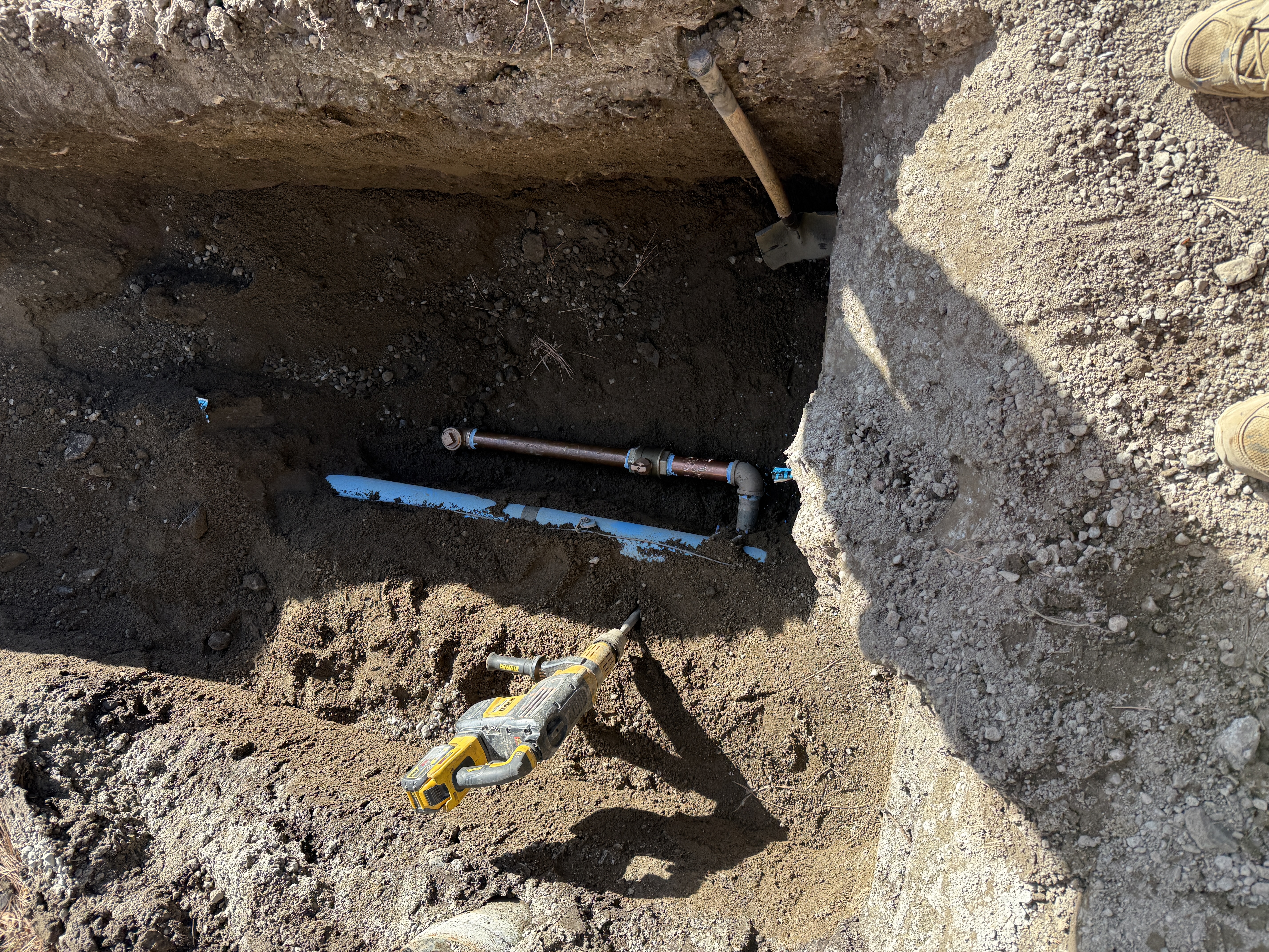 The image shows an open trench with soil and visible pipe installation work. A blue pipe is partially buried alongside some visible metallic piping, including a T-joint. A battery-powered reciprocating saw is seen leaning against the trench wall. The trench appears to be actively worked on, with loose soil around it and other hand tools visible.