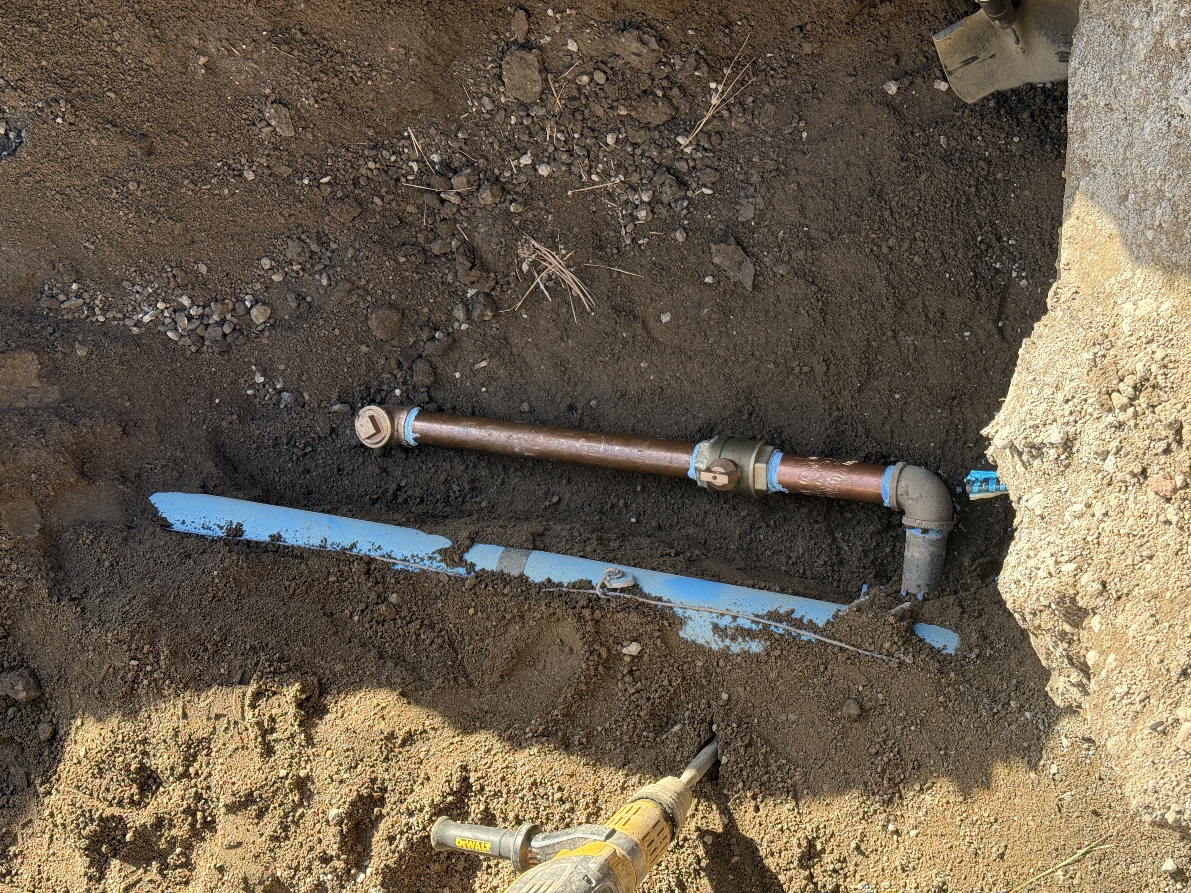 The image depicts a trench with an exposed metal pipe, which includes a valve assembly. The pipe runs horizontally in the trench, and there is loose soil around it, suggesting recent or in-progress work. A tool is visible on the side, indicating ongoing activity. The lighting suggests good visibility.