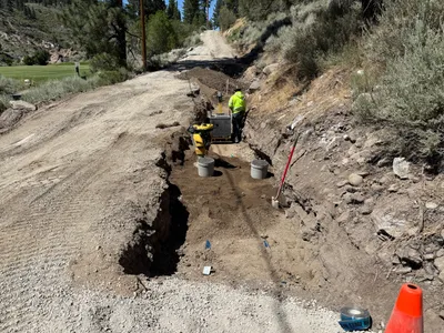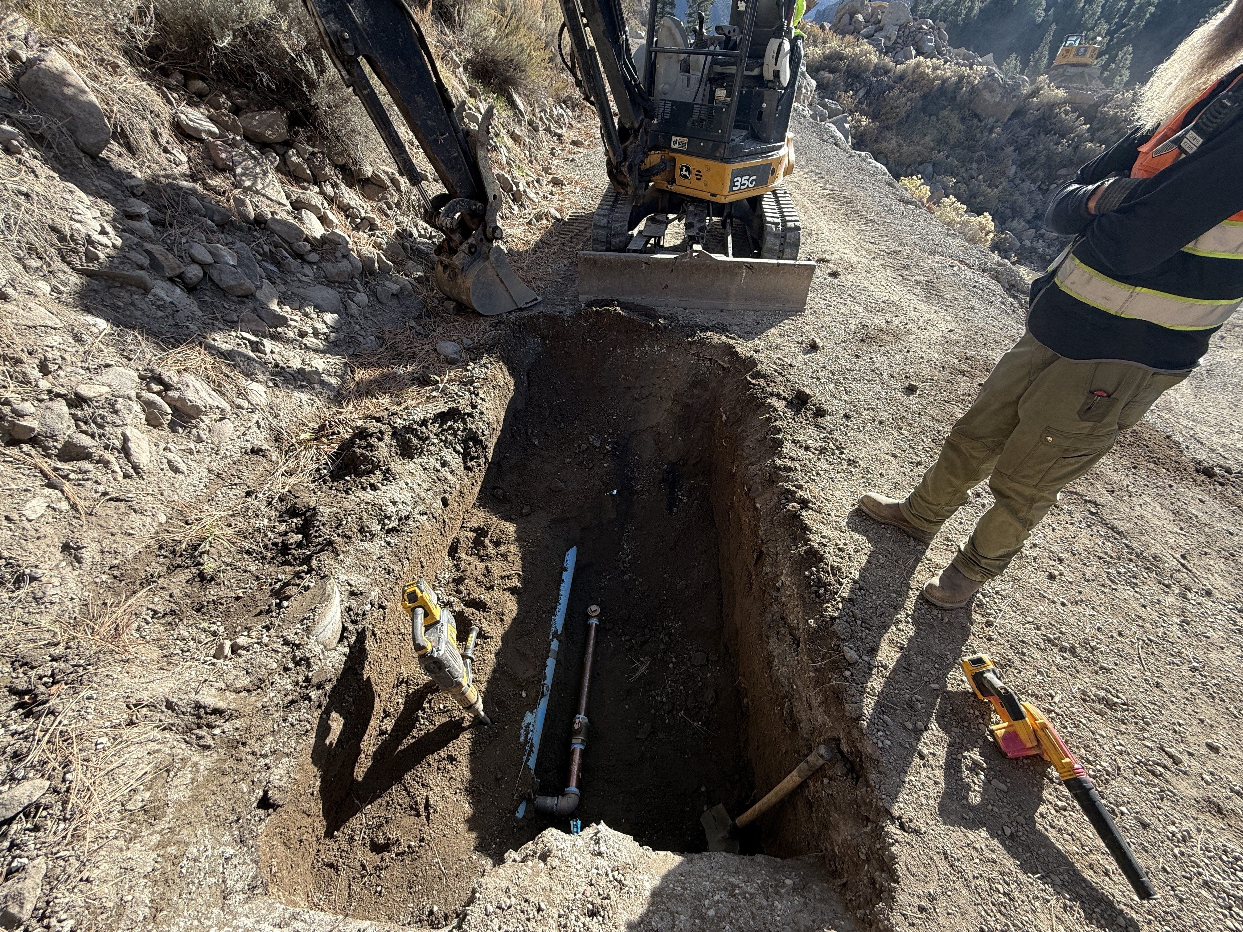 PPE such as hi-vis vest and work boots are visible; open trench presents a safety hazard.