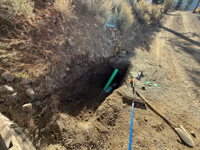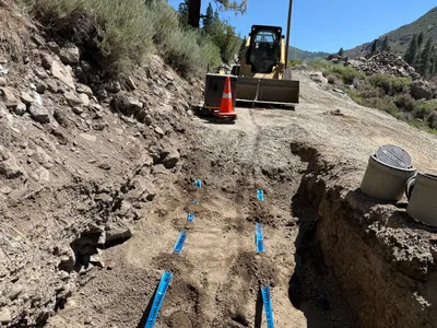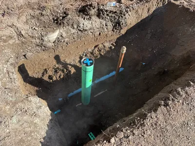 The image shows a trench dug into the ground with a small excavator positioned near the edge. Pipework with attachments are visible inside the trench, possibly for a water system. An individual on-site is wearing appropriate PPE including a hi-vis vest and work boots. The ground appears to be comprised of dirt and rocks.
