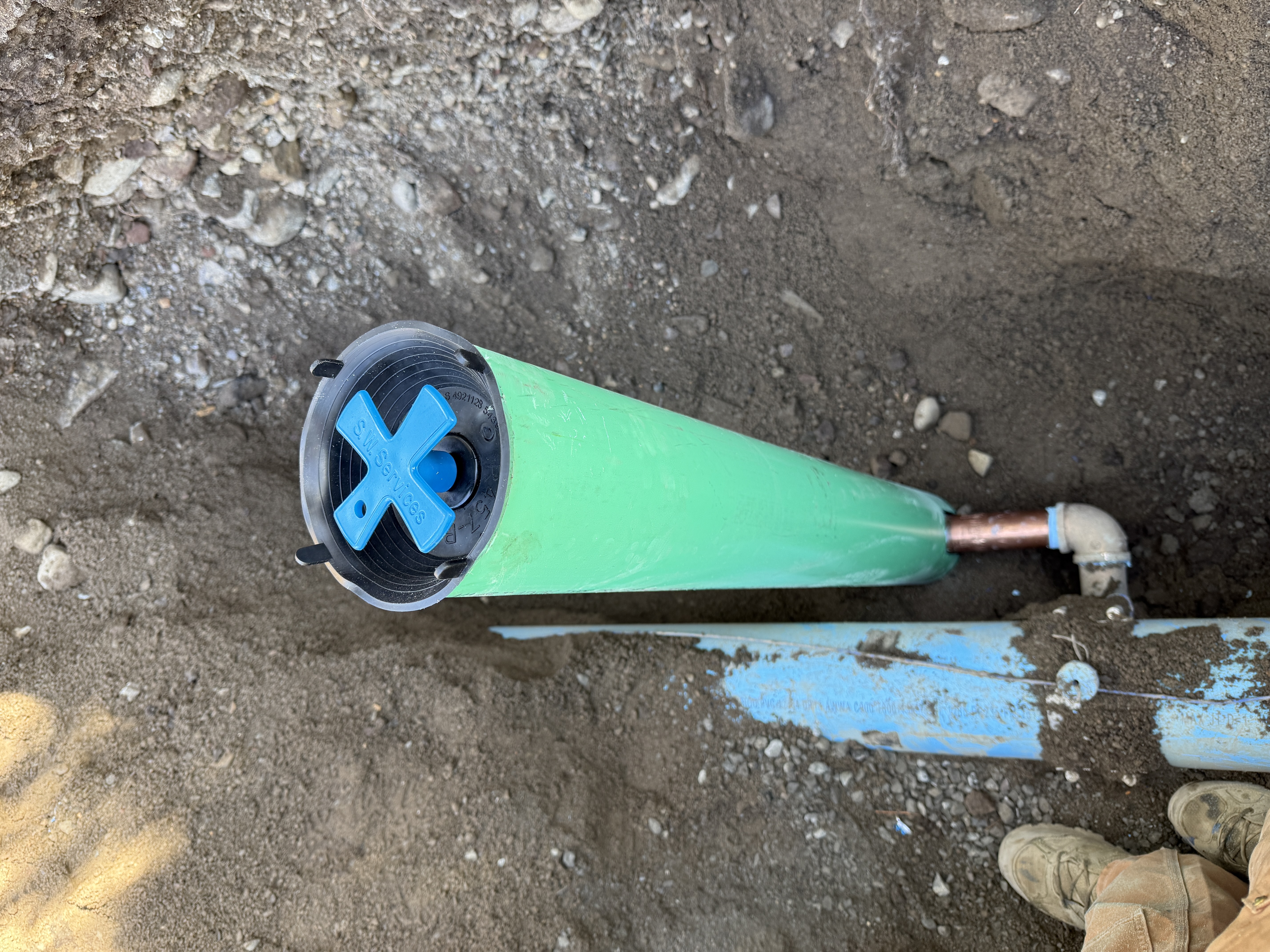 The image shows a blow-off assembly at the end of a trench. A green access pipe with a blue cap extends vertically, and below it, a blue horizontal water pipe connects to a copper assembly. Loose soil surrounds the trench area, indicating recent excavation. The focus appears to be on completing a blow-off or drain installation within a water system.