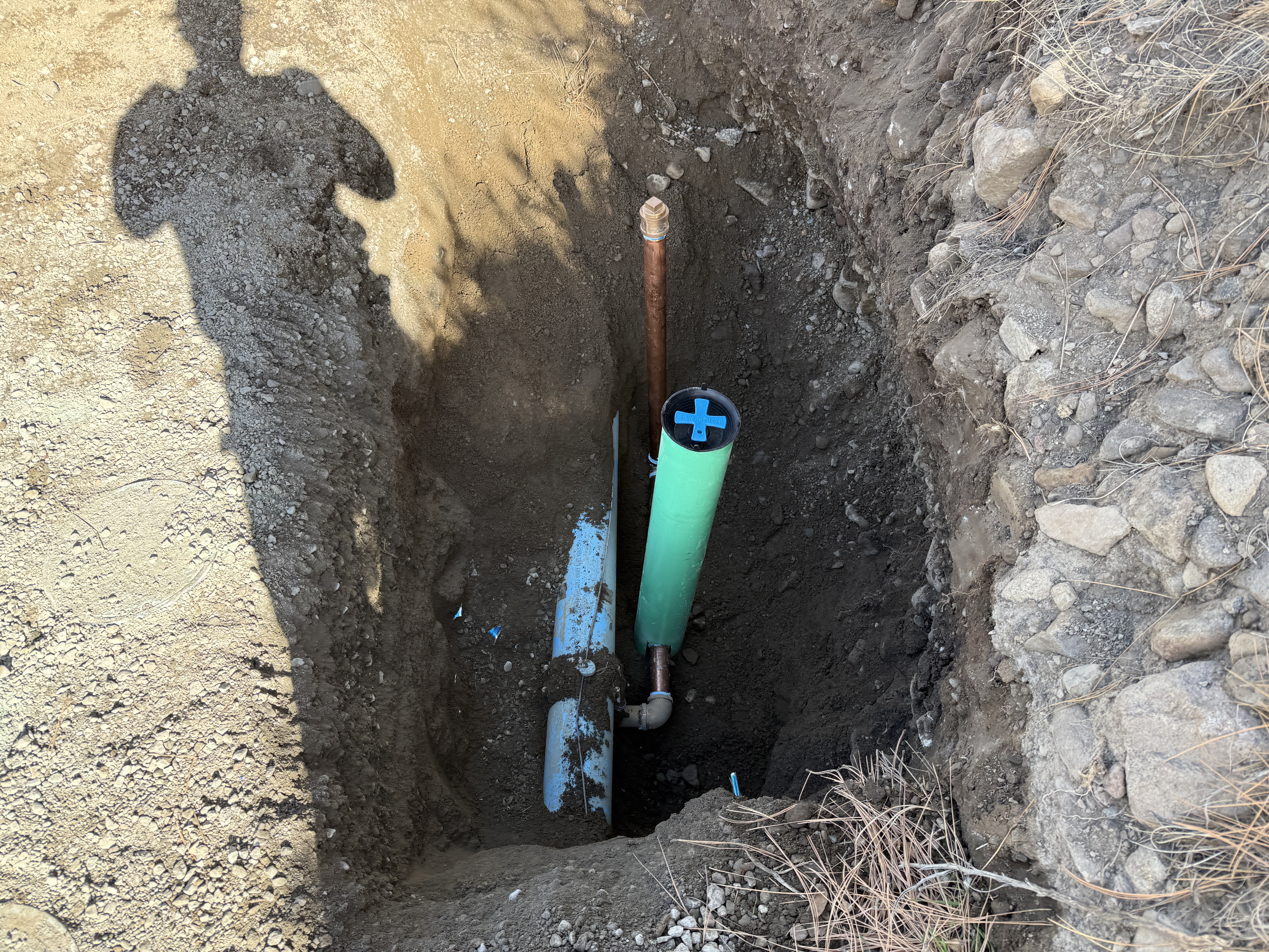 An open trench shows the intersection of a green pipe with a metal pipe, possibly copper. The green pipe is capped or marked with a blue cross. The trench is dug into rocky soil with some vegetation nearby. The shadow of a person is visible on the dirt surface.