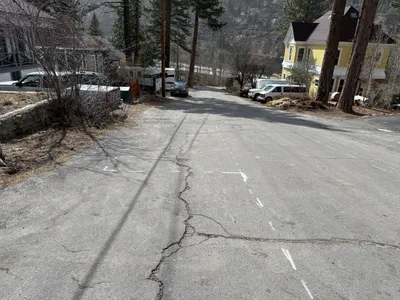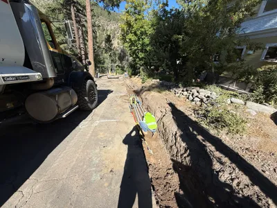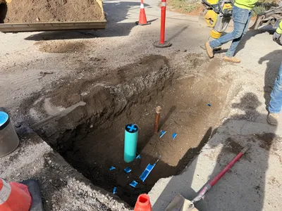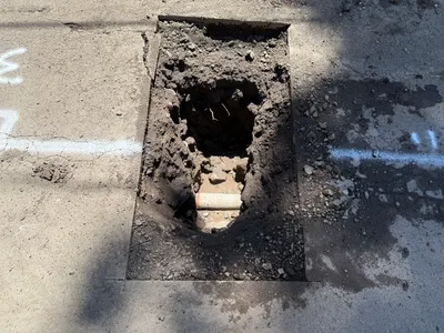 trench in compacted dirt beside road clear daylight conditions limited roadside access with open trench