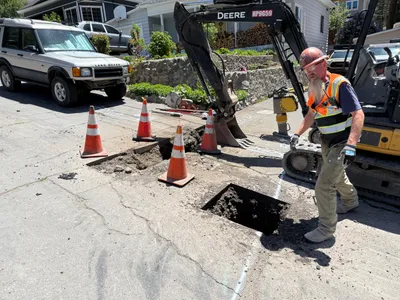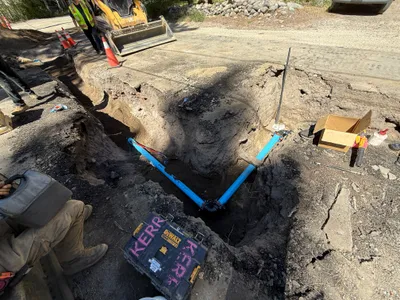 The image shows an open trench alongside a road, with a pipeline visible inside the trench. A piece of construction equipment is stationed near the trench, and multiple traffic cones are placed around the area. One worker in a hi-vis vest and hard hat is visible next to the trench. The area is bordered by a dry, rocky embankment with a fire hydrant nearby.