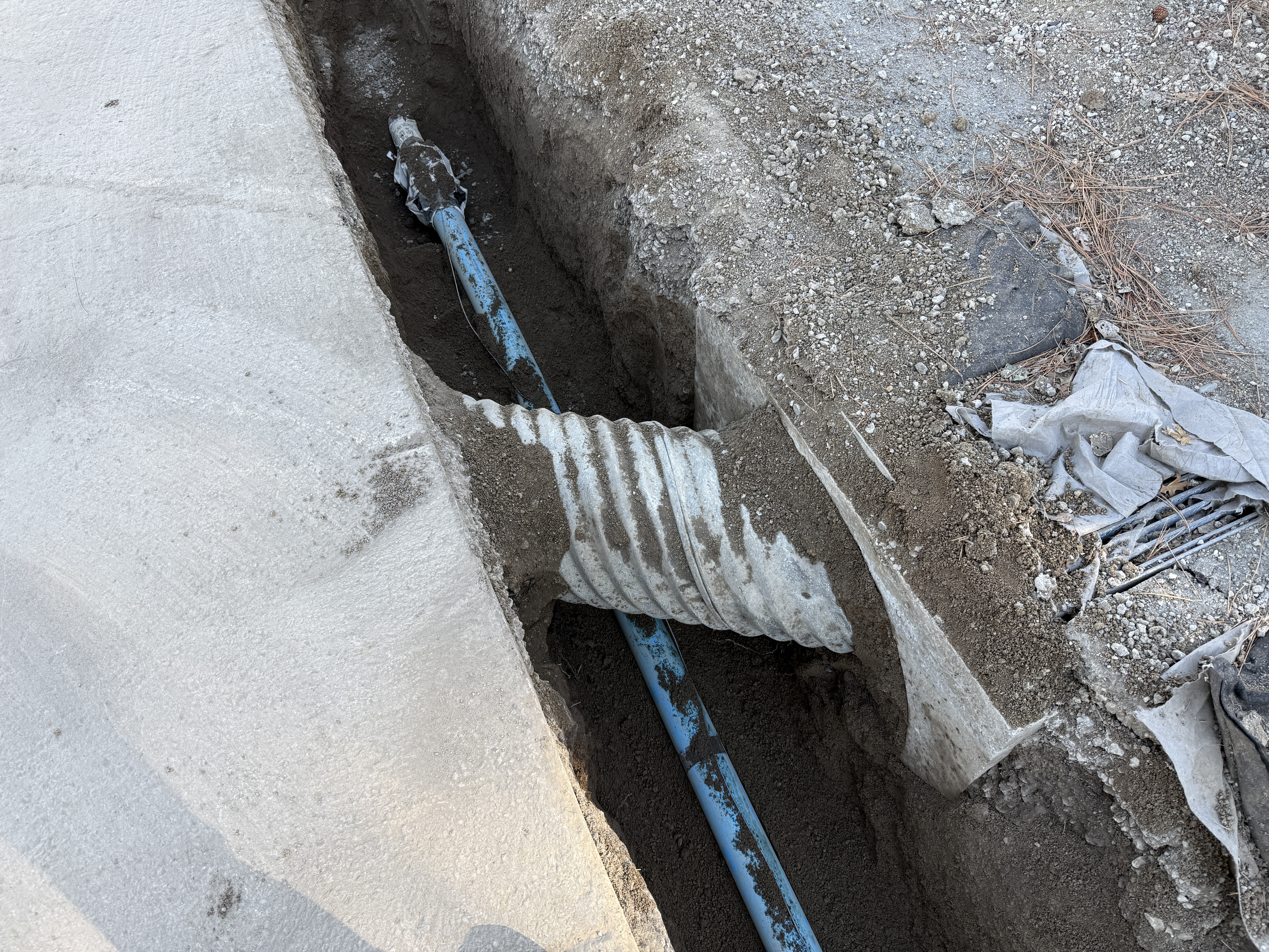 concrete surface with open trench and loose soil no adverse weather visible, ambient daylight open trench with no visible access obstructions
